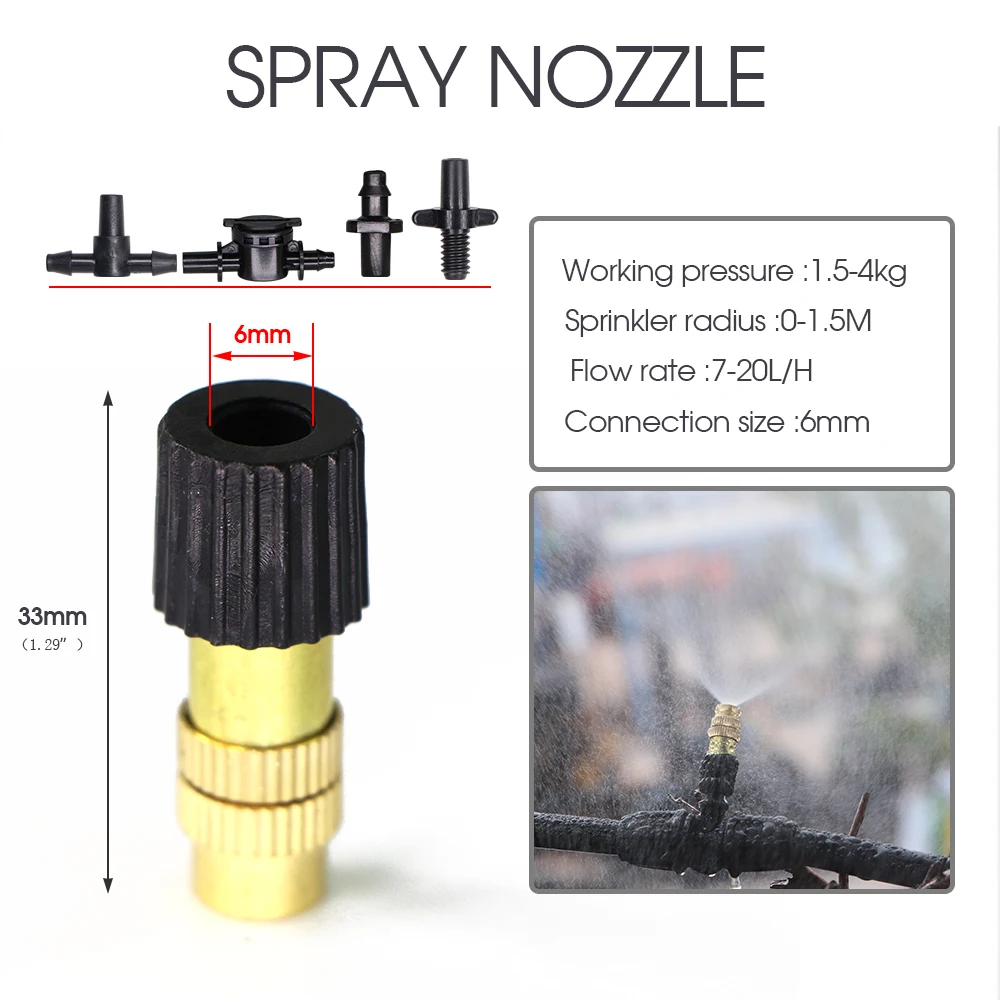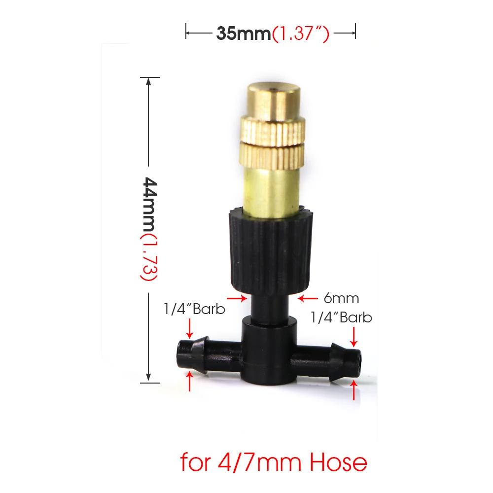 -For this type of tee mist nozzle, it connects 4/7mm hose (inner diameter 4-5mm) or called 1/4'' tubing. The nozzle is adjustable, so that it can reach best mist effect after adjustment.