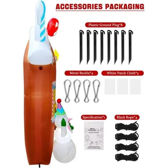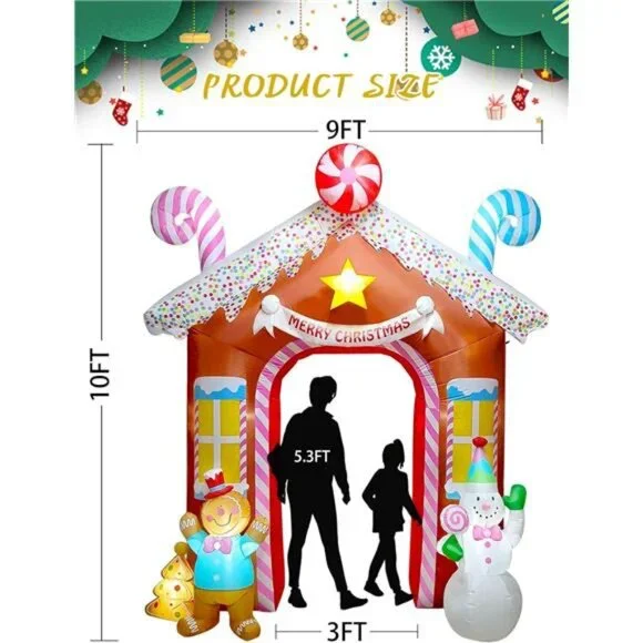 🧿⛄ Gingerbread House Inflatable: This Christmas inflatable arch is made of various classic elements, up to 10FT high, the left and right sides of the arch are guarded by gingerbread men and snowmen, and the roof is decorated with three different candies, creating a fun festival atmosphere.🧿🎄 Long Time & Stable Standing: The package come with 2 sandbags and 8 ground stakes to keep snowman inflatable arch in balance, and the powerful fan can keep the gingerbread house inflated continuously and steadily.🧿💡 Eye-catching At Night: With 11 LED lights designed, when night comes, the gingerbread inflatable arch presents another charming image. What’s more, the lights can last for a long time, making your outdoor Christmas display memorable.🧿⏰ Easy To Set Up: Just need 2 minutes to inflate Christmas blow up decoration, put sandbags or other heavy objects on both sides of the arch to maintain stability, fully close the zipper, and plug in a suitable socket. Waiting for 2 minute, you will get a super cool gingerbread man arch.🧿🎅 Festival Outdoor Decoration: Gingerbread inflatable arch is a wonderful decoration for Christmas, party, indoor, outdoor, lawn, yard, garden, patio, shopping mall, front door, and any other place to welcome new year.