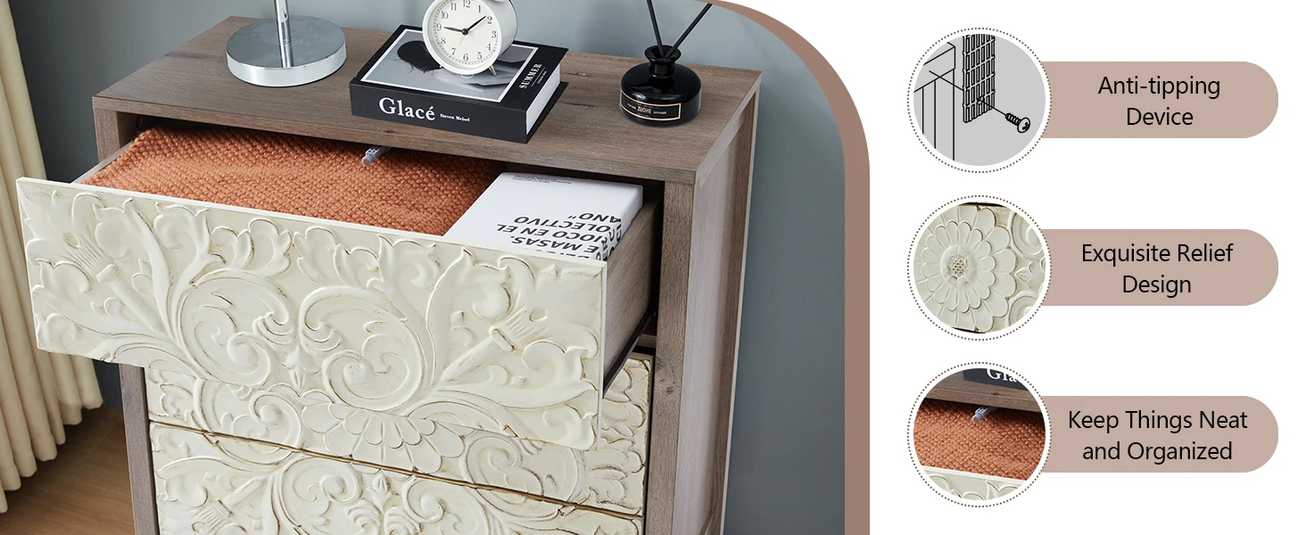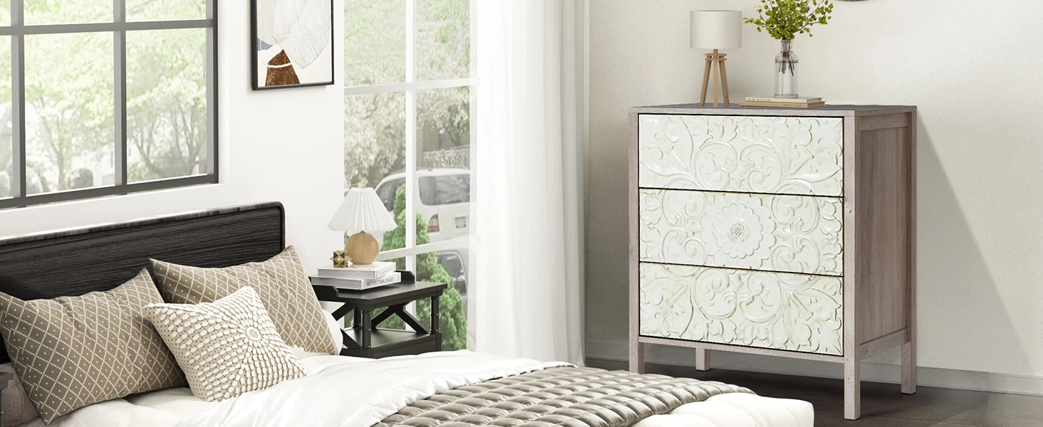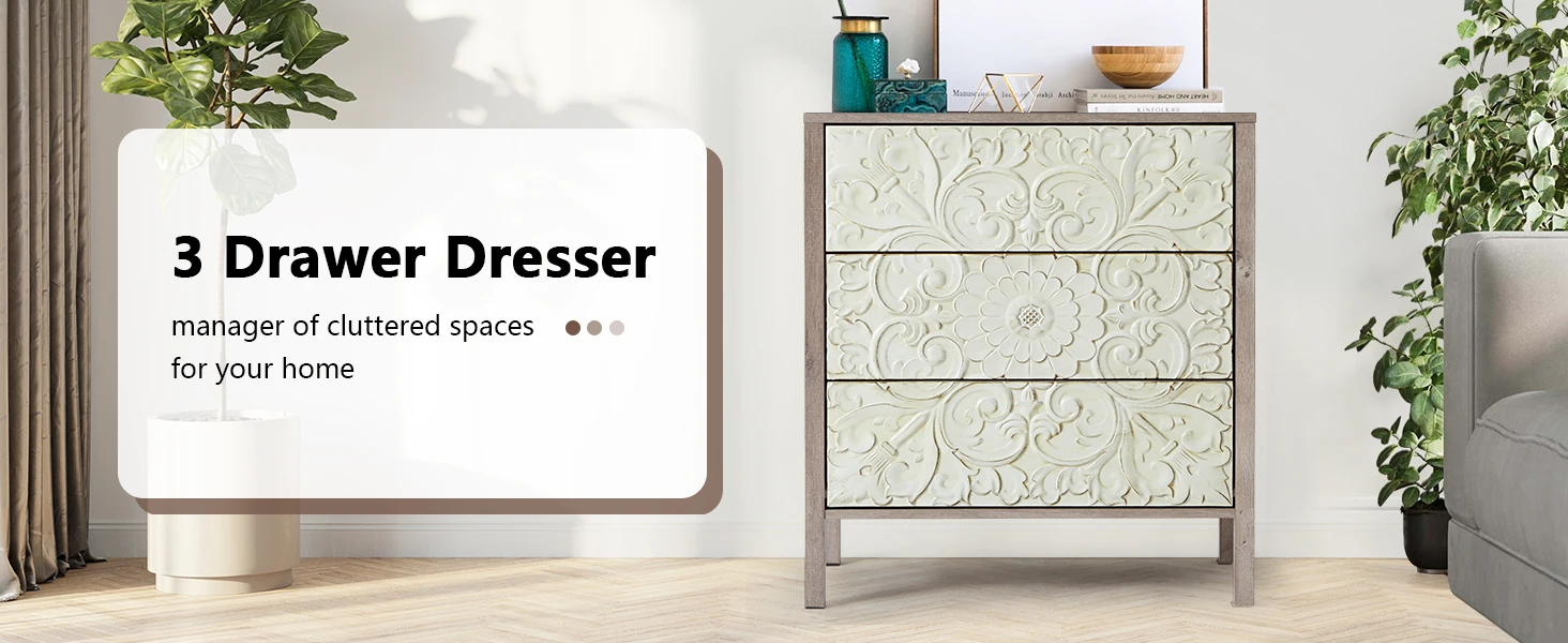 2. CHIC ACCENT STYLE: The 3 drawer dresser with storage boasts decorative finish, the combination of classical and stylish design brings glowing looks to your space. The surface relief process door makes the dresser unique and luxury. Smooth and flat surface of this bedroom dresser is easy for you to clean with damp or dry cloth.