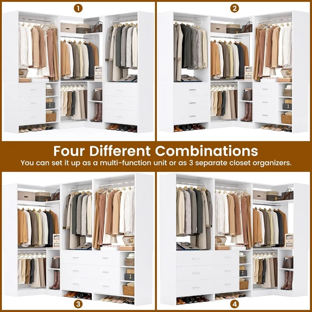 3 Sets of Wardrobe Systems, 86.8-inch Wardrobe Storage System with 6 Drawers and 4 Hangers, L-shaped Walk-in Wardrobe