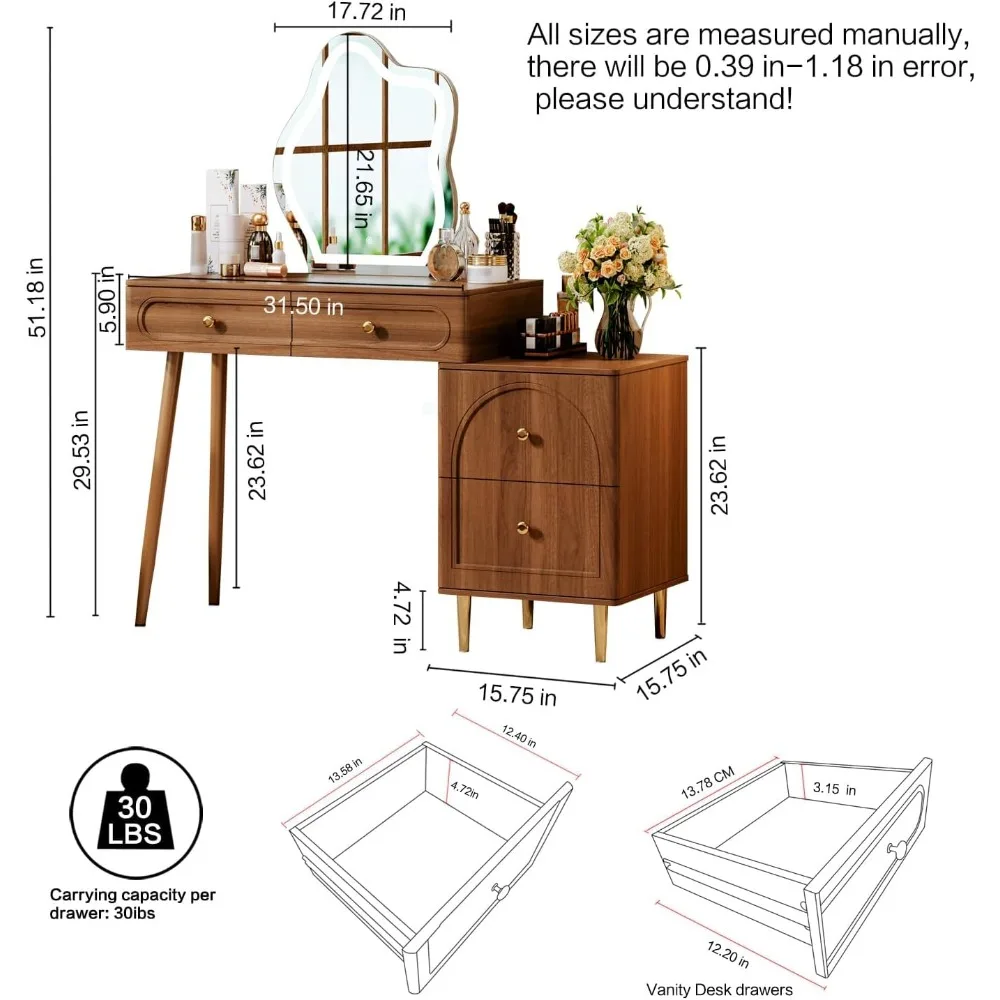 31.5" Brown Stylish Corner Makeup Vanity Table,with Lighted Mirror and 4 Spacious Drawers,Bedroom Essential Dressing Table