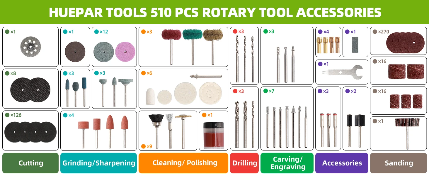 2. This 510pcs rotary tool accessory kit comes with a wide variety of accessories such as cutting discs, polishing kit, drill bits, carving bits, collet set, etc.