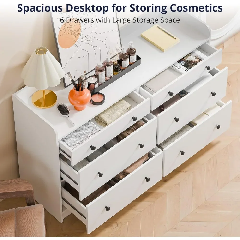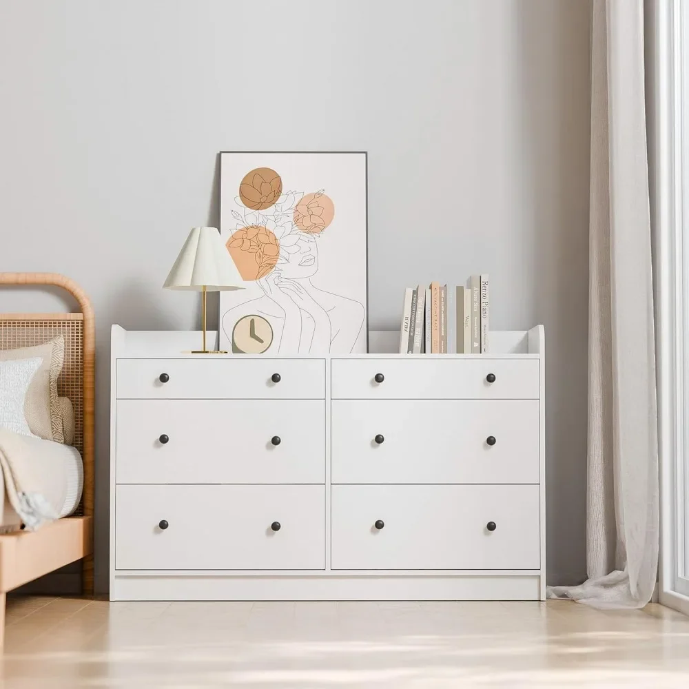 LARGE STORAGE SPACE: 6 drawer dresser with black metal handles perfect as a display cabinet with spacious countertop to place necessities and decorative items such as vases, photo frames, CD players, printers, lamps, magazines or mirrors, etc., making it a stylish freestanding storage cabinet. Anti-tip parts included for child and pet safety