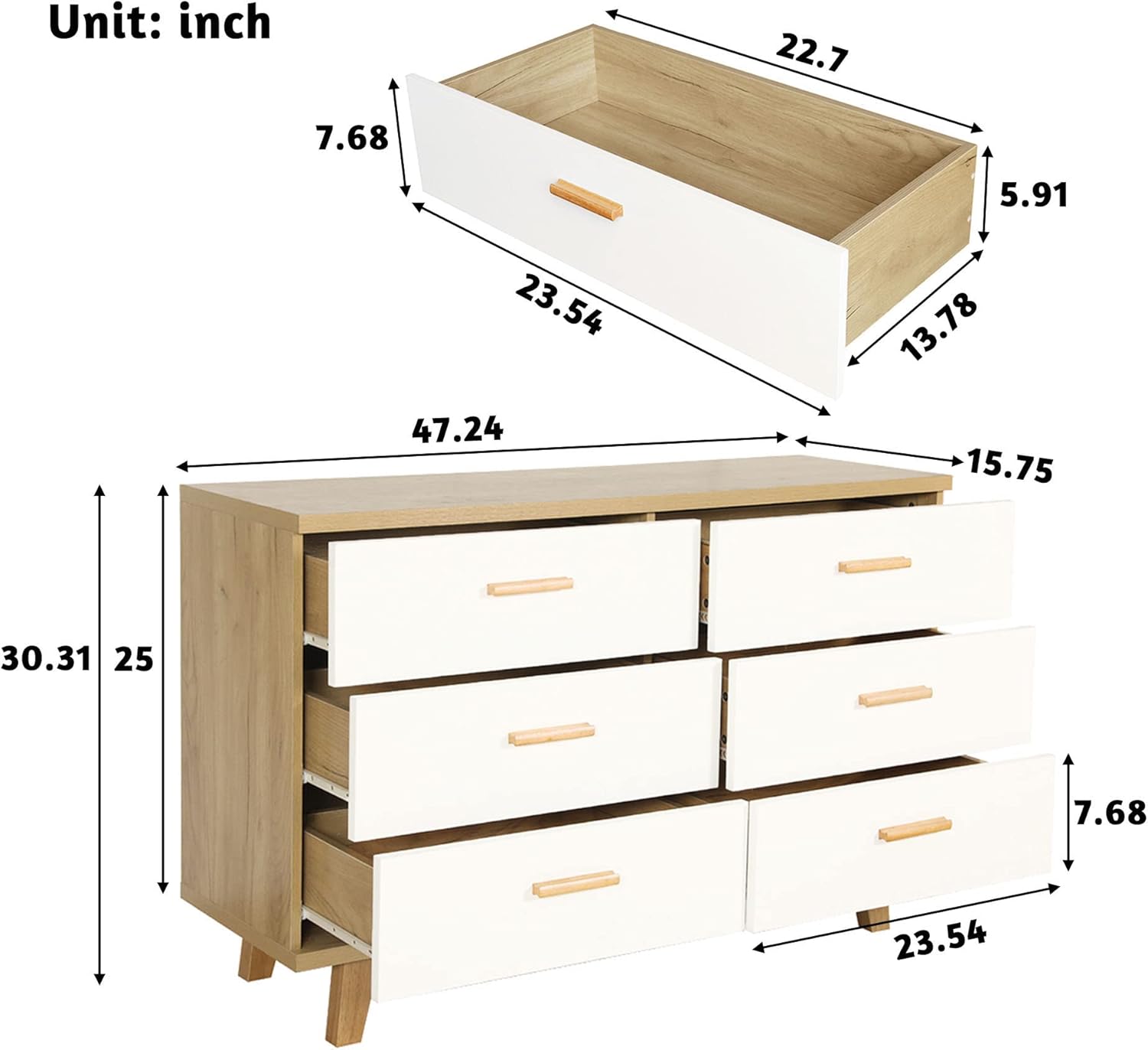 6 Drawer Dresser For Bedroom,Natural Wood Dresser,Modern Dresser,White And Brown Chest Of Drawers For Living Room