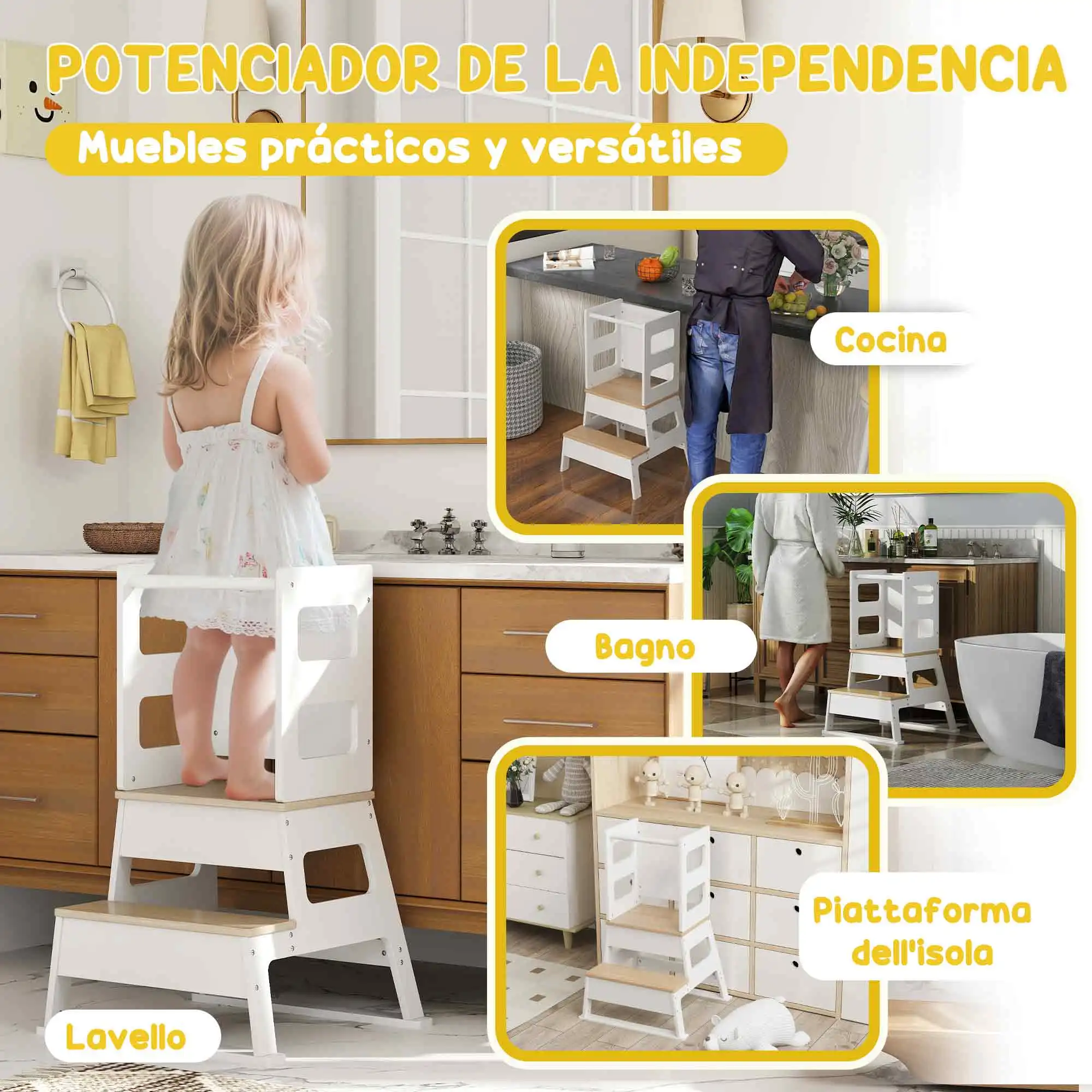 Fomenta la autonomía de tu hijo con esta torre de aprendizaje de AIYAPLAY. Permite a los niños alcanzar lugares altos, ya sea para cepillarse los dientes o ayudar en la cocina. Equipado con una divertida pizarra, cuenta con una estructura trapezoidal segura y una barrera de protección que asegura la máxima seguridad para los más pequeños. Es la opción ideal para ayudar a los niños a desarrollar su autonomía y confianza, convirtiendo las tareas diarias en momentos de diversión y aprendizaje.