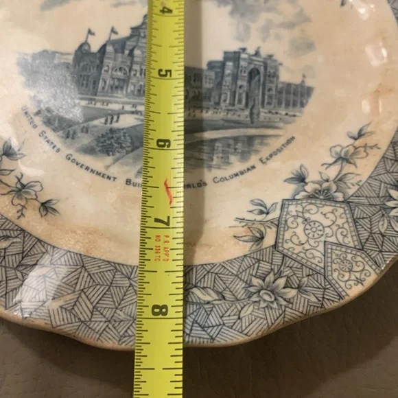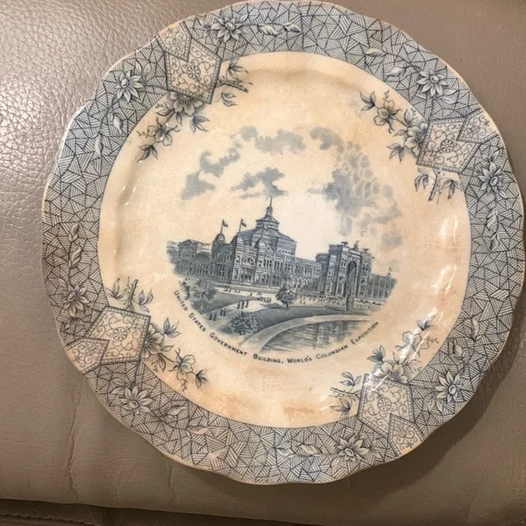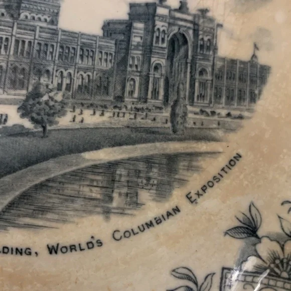 1893 COLUMBIAN EXPOSITION SOUVENIR WEDGEWOOD PLATE. Wonderful souvenir keepsake from 1893! Muted blue/gray ink, fluted edge.Lots of crazing and stains. Trademark stamps and markings intact.Photos show measurements and condition. No smoke,odors or pets. No chips or cracks. Antique, WEDGEWOOD,porcelain,china,Victorian, COLUMBIAN Exposition, souvenir
