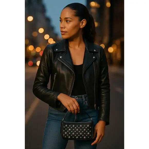 Brand: Jimmy ChooStyle: Small Shoulder BagColor: BlackMaterial: Genuine LeatherFeatures:Eye-catching silver-tone star studs on frontTop zip closureDetachable short strap with approx. 7.5" dropFully lined interiorCompact and stylish – perfect for day or nightMeasurements (approx.):Width: 8.5 inchesHeight: 5.25 inchesStrap Drop: 7.5 inchesCondition: Excellent preowned condition. Minor signs of wear on leather, consistent with light use. See all photos for close-up details.This edgy yet elegant Jimmy Choo bag adds instant glam to any outfit. A collector's favorite!