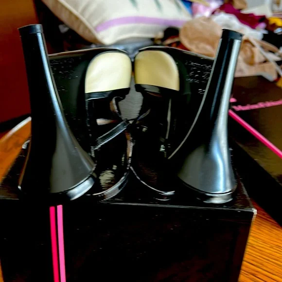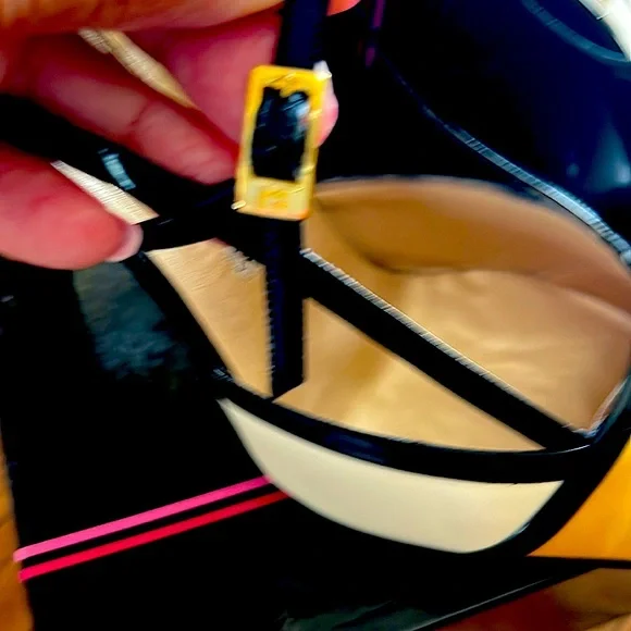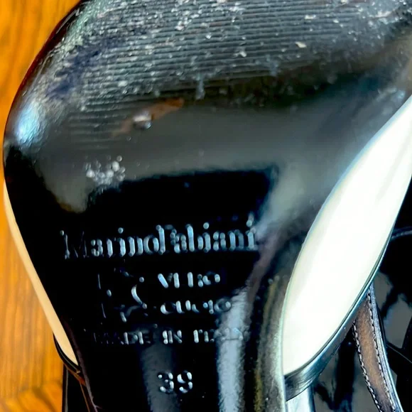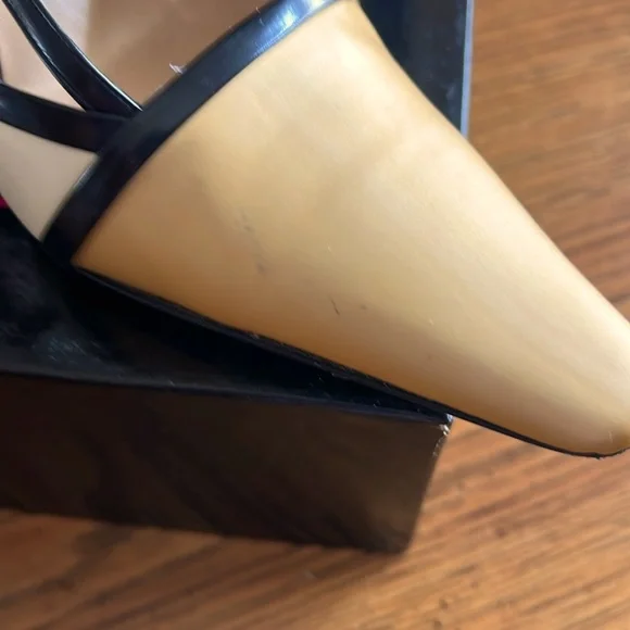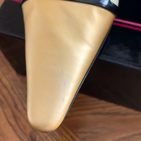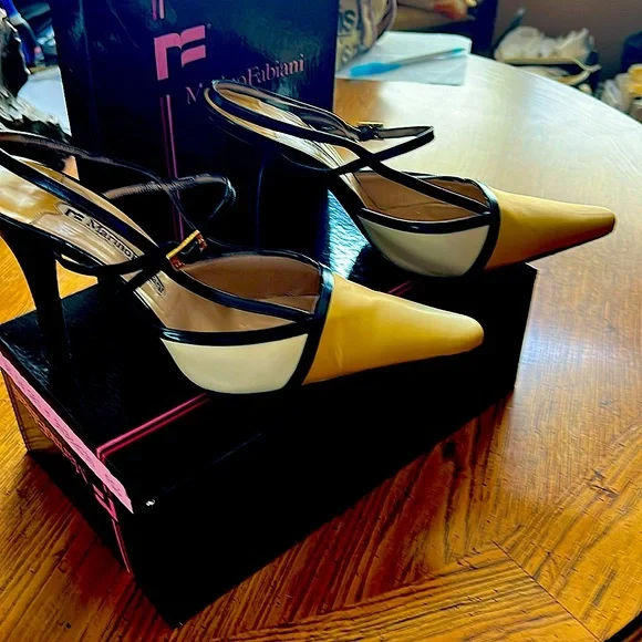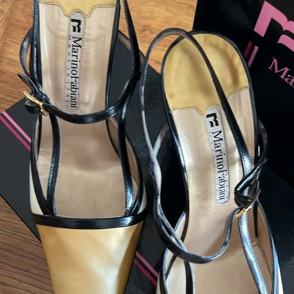Authentic Mario Fabianiall leather pointed sling back shoe with ankle straps.Box included!Size 39 which is US size 8.Gorgeous and Elegant design. Soft gold on the front with tan leather on both sides.Black heels , not a mark on them…approx: 4.5” in length.Ankle strap. Gold metal buckle on ankle strap with signage.Dress up or wear with jeans. Summer, Fall, and winter. Business wear ornights.Versatile use with the mix of colors.See photos for slight mark on front.Otherwise in very good condition.Bundling available with a 5% discount on 2 items.Questions and offers are welcome. Same day shipping!