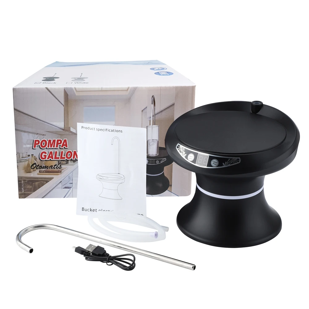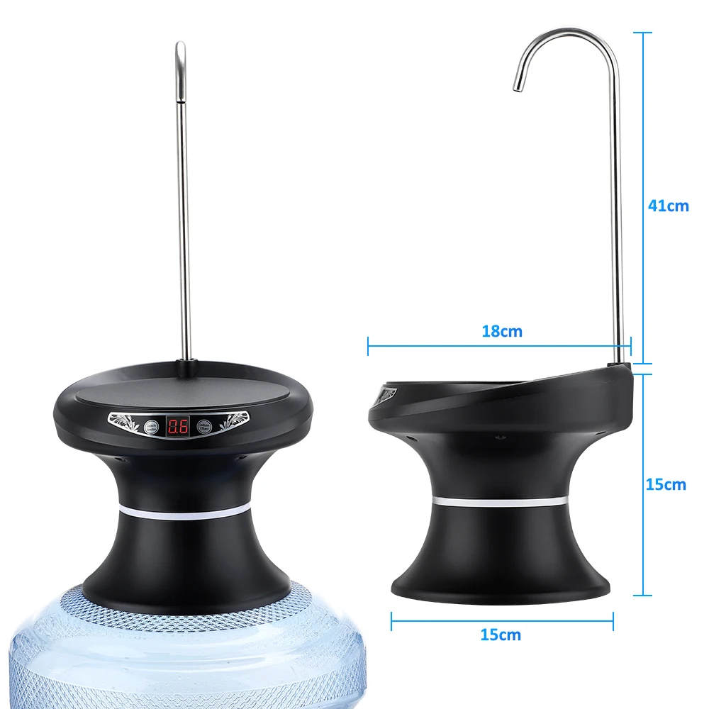1. Dual-purpose water pump: It can be installed at the mouth of a bucket or used on an external desktop to meet the needs of different environments.2. Tray design: It can be used to place the water cup to receive water, no need to manually receive water, making it easier to receive water.3. Two water outlet modes: 5 levels of quantitative pumping (0.3L/0.6L/1L/1.5L/1.8L) and continuous water output, you can choose at will.4. Touch screen buttons, one-key quick water output, simple and quick operation, even the elderly and children can use it easily.5. Compatible with barrels of various capacities, such as 4.5L, 5L, 7.5L, 10L, 11.3L, 15L, 18.9L.6. Suitable for many occasions, such as kitchen, dormitory, living room, office, outdoor, etc. 7. Built-in 1200mAh high-capacity lithium battery, it can be used for 15 days each time it is fully charged (pump 4-6 buckets of water).Packing List: