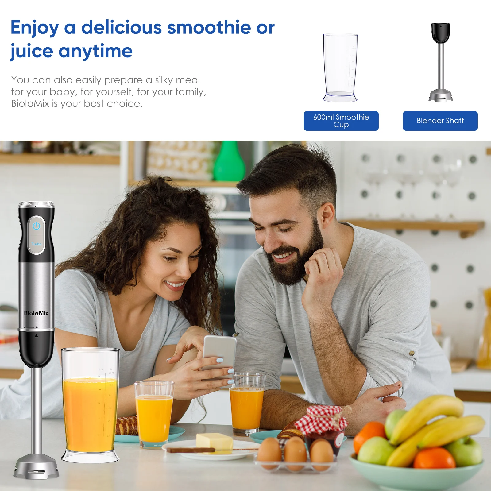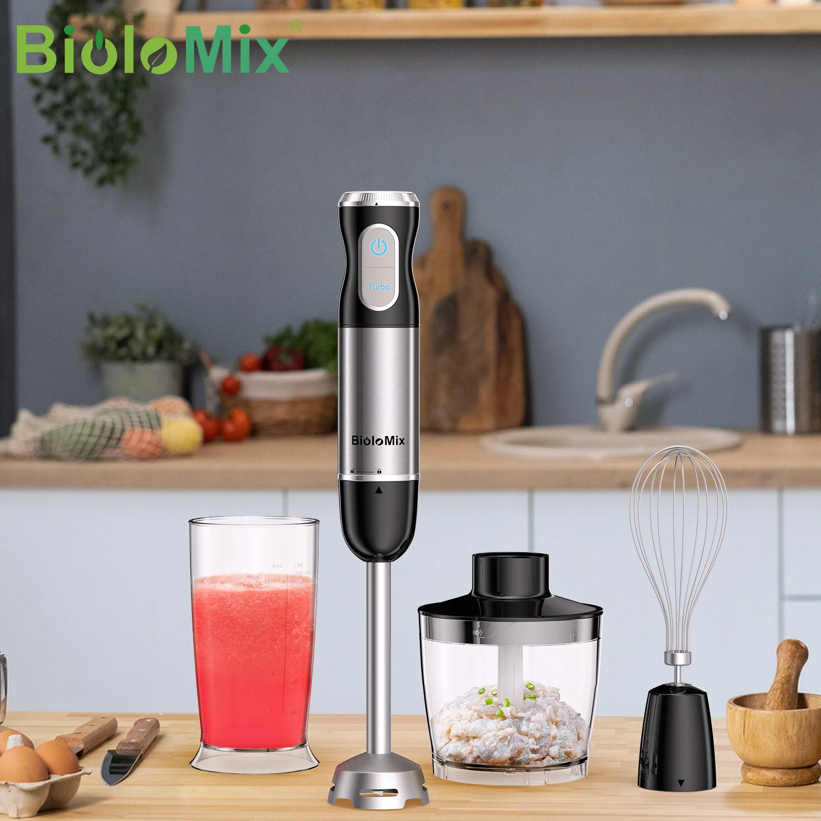 1. COMPLETE IMMERSION BLENDING SYSTEM: The BioloMix Hand Blender is equipped with attachments for blending, whisking, and chopping. Its spacious chopper bowl and smoothie cup are entirely BPA-free.