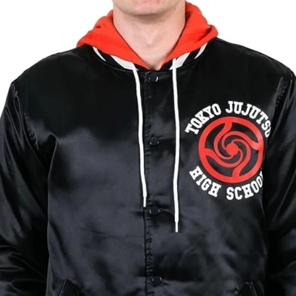 CUSTOM DESIGN: The logo for the Tokyo Jujutsu High School appears in red on both sides of this bomber jacket while white letters around the logo spell out the school's name. Fans of the Jujutsu Kaisen anime will love this fun design.HOOD: This bomber jacket comes with a red fleece hood to protect you from the cold weather. Wear the hood for protection from the rain, wind, and snow, or leave it hanging loose behind you in milder weather.OFFICIALLY LICENSED: This Jujutsu Kaisen bomber jacket is officially licensed and makes a great gift for fans of the anime and manga. Celebrate your favorite series in comfort and style with this bomber jacket.HIGH-QUALITY MATERIALS: This Jujutsu Kaisen bomber jacket is made with durable, high-quality 100% polyester satin materials to help you stay comfy and cozy while you enjoy the cold weather and your favorite anime series.MACHINE WASH: For simple, easy care, machine wash this Jujutsu Kaisen TJHS Logo bomber jacket on cold with a load of like colors and tumble dry on low heat.