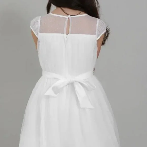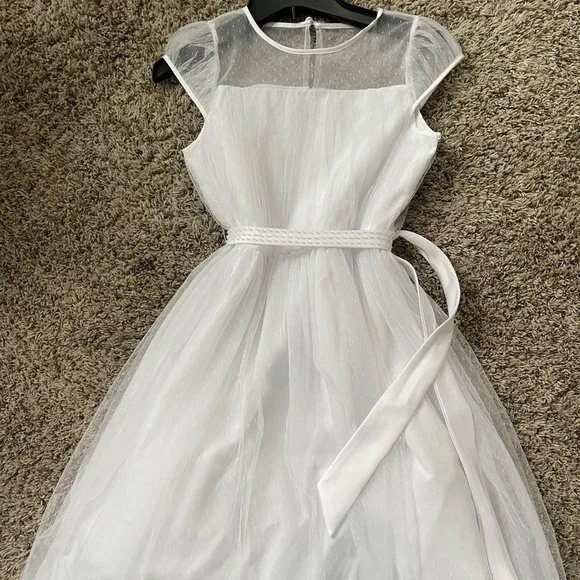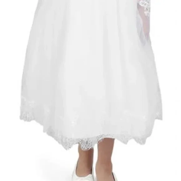 Worn just once!Gloves not includedAn illusion neck and sheer cap sleeves top off an ethereal white dress finished with a lace hem for your kid's special day.The Viola dress is a girls first communion dress is made of soft pointe d’espirit mesh, with an illusion neckline. The bodice is pleated, and dress features a hand-beaded satin waistband- which is removable.This dress features thin satin binding at the sleeve and neckline, and chantilly lace at the hem of the skirt.https://www.usangels.com/collections/communion-dresses/products/copy-of-c927