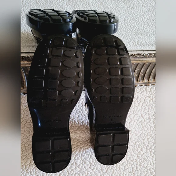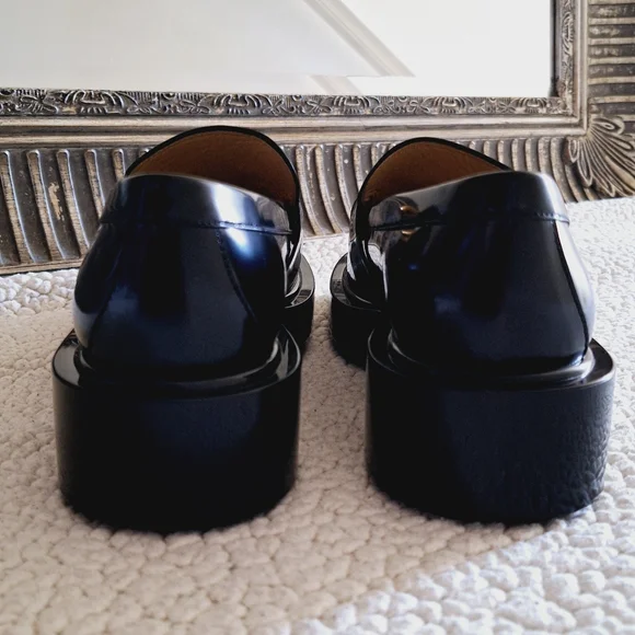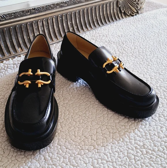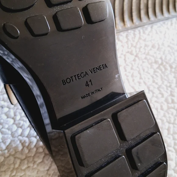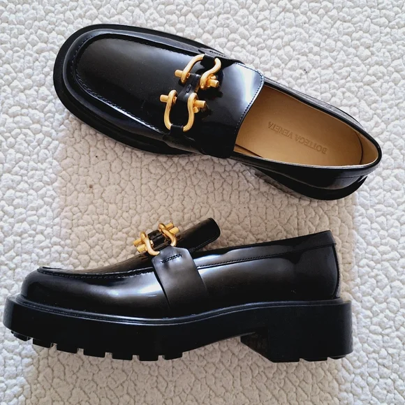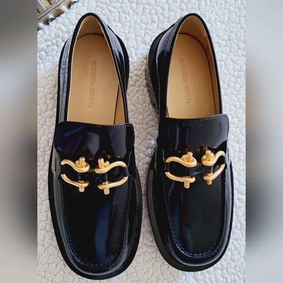 Since his debut last year, designer Matthieu Blazy has leaned into Bottega Veneta's foundations, delivering new iterations of house signatures.The 'Monsieur' loafers are crafted from soft calf leather into a classic silhouette with gold-toned hardware atop the vamp. Wear with tailored suiting or jeans, goes with anything!Glossy leather finishHeel height measures approximately 45mm / 1.75"Slip onComposition: calf leatherLining: Lambskin• Color: Black• Hardware: Gold finish• Rubber outsoleMade in: ItalyPlease, look at the four last pictures! There is a little dot dent on the left shoe, really not that visible, but wanted you to be aware. Also, there is about 0.5" cuton the outside part of the right shoe, by the heel. Last 3 pictures reflect. Priced accordingly. Probably can be esily fixed at shoe repair.