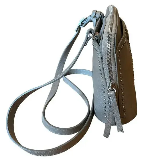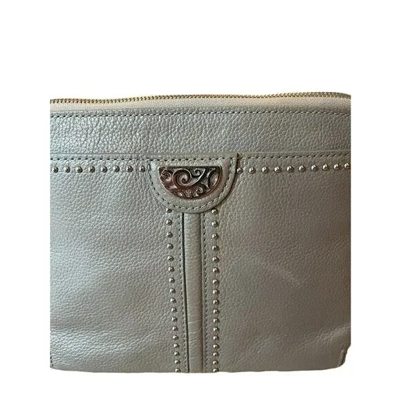 This Brighton JoJo crossbody bag is a must-have for any fashion-forward woman. With a silver zip closure and gray leather exterior, this medium-sized bag is perfect for everyday use. The bag features studded accents, a crossbody strap, and a key holder for added convenience.The interior is lined with gray fabric and includes inner and outer pockets for ample storage space. The bag also has a depth of 3 inches and a height of 7 inches. The crossbody strap is adjustable and made of leather, while the handle style is a crossbody strap. The bag is part of the Brighton Pretty Tough product line and comes with a bag charm. It is in excellent condition. The only flaw is a few small stainless on the inside lining in the middle zippered pocket which I did not attempt to remove. Outside is perfect! A great purse!