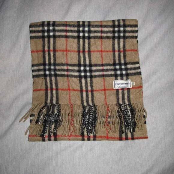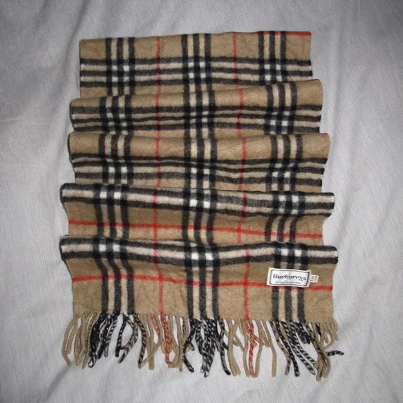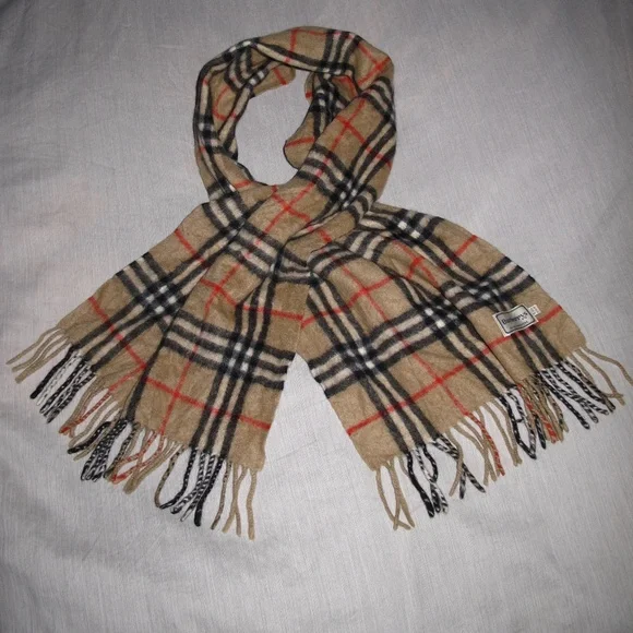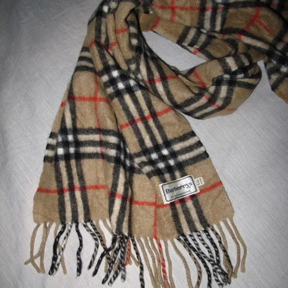 Authentic Burberrys CASHMERE Label is custom for Asian market, not sure if it's Japanese or Korean.SUPER SOFT 100% pure cashmere. Nova plaid: 12" wide by 48.5" long (53.25" with fringe) Colors: Tan, red, black and naturalExcellent vintage condition. No holes, no snags, no odors. Freshly hand washed and laid flat to dry. (YES you can hand wash cashmere... better than dry cleaning imo) Most of the wrinkles in the photo have already smoothed out.No cats, no smoking home. Inventory ref. D-17