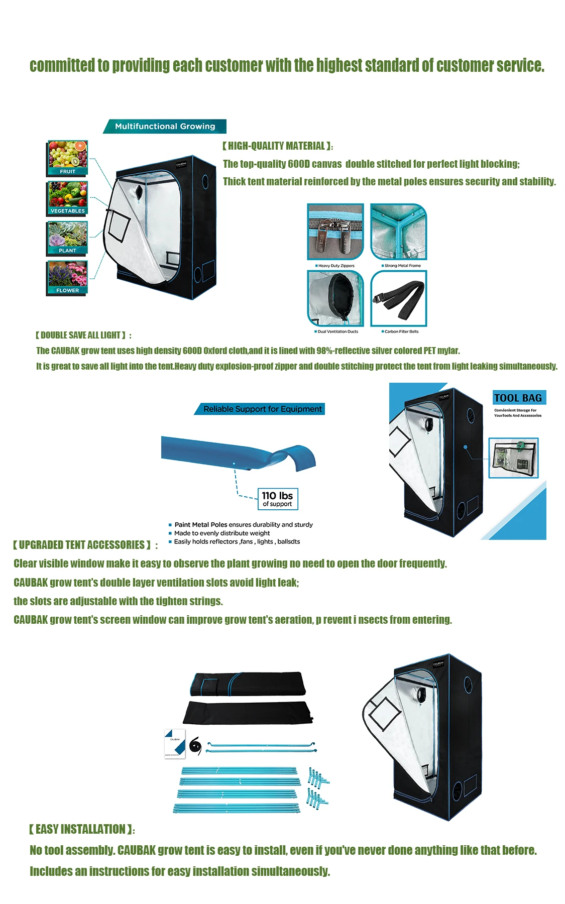 Easy to assemble: Indoor planting tents are easy to install, including instructions and do not require tools. The openable doors and observation windows of the giant planting tent provide more convenient access, making it easier to observe your plants.