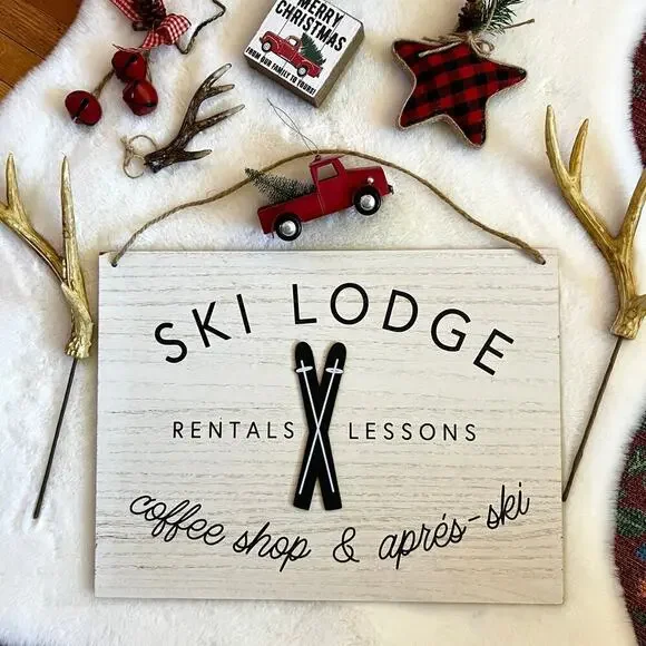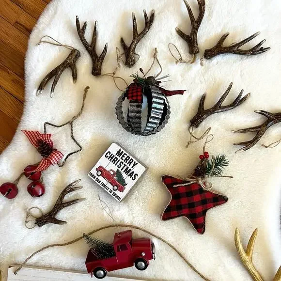 Christmas Decoration Ski Lodge Sign and Rustic Farmhouse Ornaments and Decor Bundle8 Antlers ornaments2 Big antlers 1 Big Wooden Sign Ski Lodge 12" x 15.7"1 Small Sign 3"x3"Plaid rustic star ornamentStar and bells ornamentRustic ball ornamentRed Christmas truck with Christmas tree ornamentShips next business day.