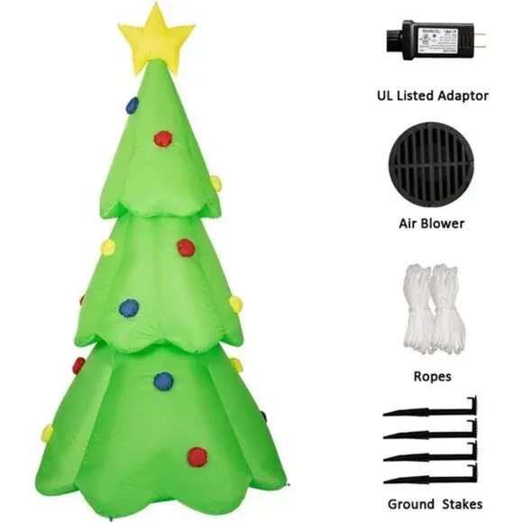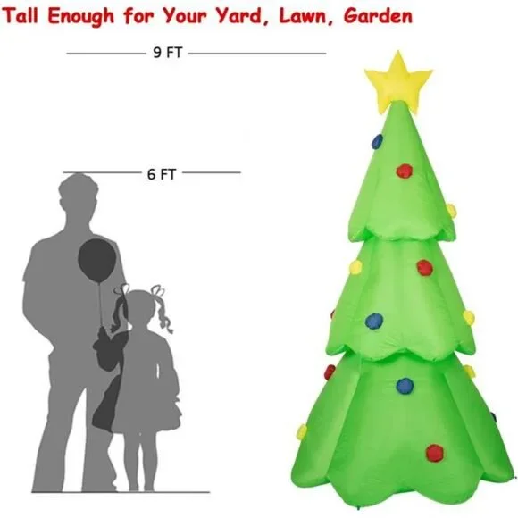 【Size】Inflated Size: 9' H x 4.1’ L x 4.1’ W, tall enough for setting it indoor and outdoor. Package size: 9.45” x 7.87” x 8.66”, shipping package with a free storage bag, very convenient and space-saving.【Quality】This 9 Feet inflatable Christmas Tree is made of High quality polyester cloth which allows multiple use for Xmas themed party. UL certified adapter ensures safety for outdoor use, making it even safer.【Design】Christmas Inflatable Blow up Xmas TREE Decor is Built-in LED Lights, not only has white light, it can change color! Even at the night, it’s still colorful, shinning and makes your yard more eye-catching. Setup is super simple. It will self pop up in seconds when plug in the power adapter. Comes with ropes, ground stakes which ensure more stable standing for outdoor use.【Occasions】Christmas inflatables Suit for: Outdoors and Indoors .You can place it in the garden ,yard or party etc,Perfect for Christmas Outdoor Yard Garden Decorations. bring stronger feeling of Christmas atmosphere to your friends and family. Ideal for decorating homes, offices, or even classrooms with a happy and prosperous festive