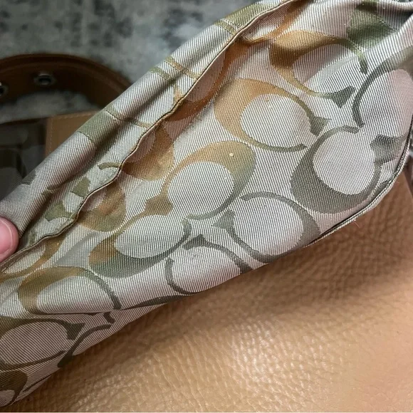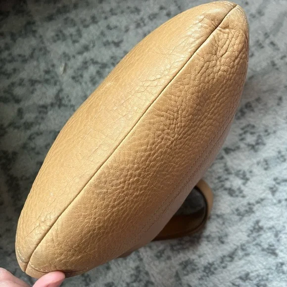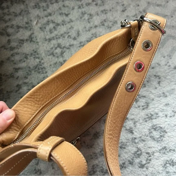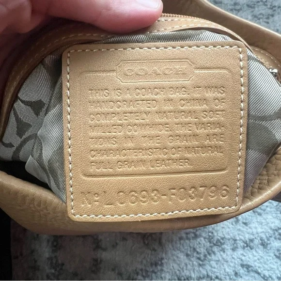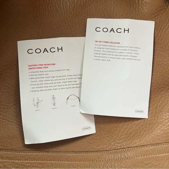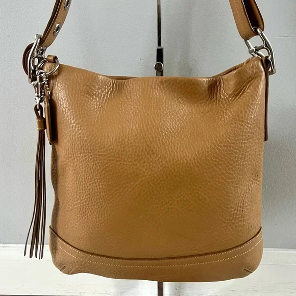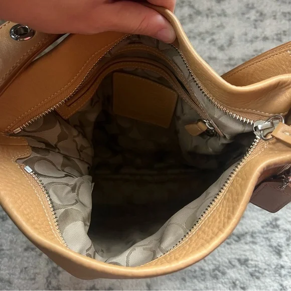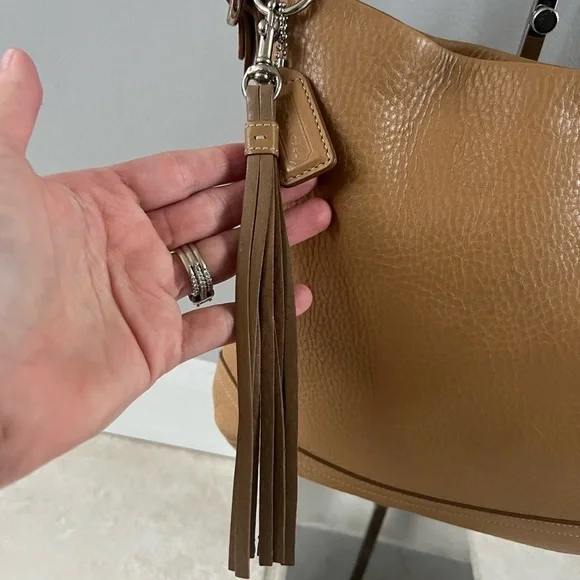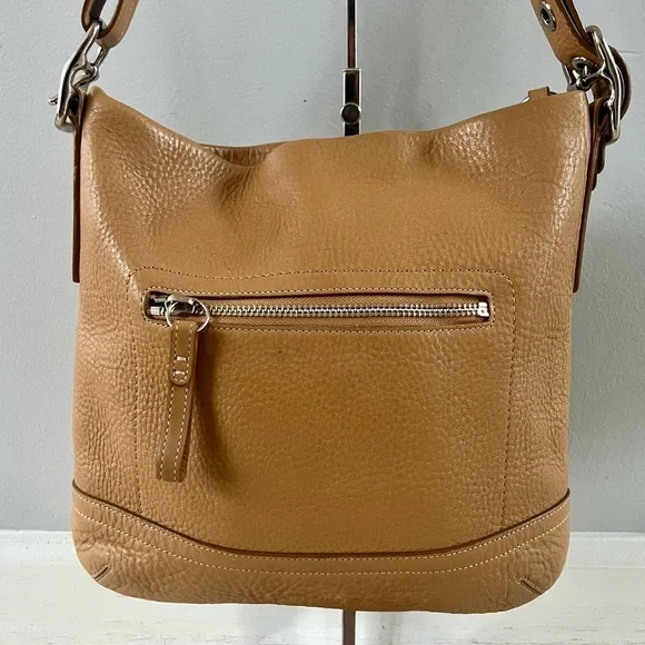 Coach Soft Pebble Leather Tan Crossbody/Shoulder Bag #F03796Part of the Soft Pebble Collection—this Collection is crafted in natural, milled cowhide leather that has been left virtually untreated. The end result is a product with a soft, textured feel and a classic Coach look. Signature C fabric lining Outside and inside zipper pocketTop zip closure, leather tassel on zipper. Coach handtagCan be worn as a shoulder or crossbody bag. Comes with original directions on how to change strap. Photos show the strap doubled up as a shoulder bagMeasures approx 10” x 11” x 3”In great condition! See photos for some light wear on the leather and stains on the bottom of the lining Fast shipping, offers welcome!