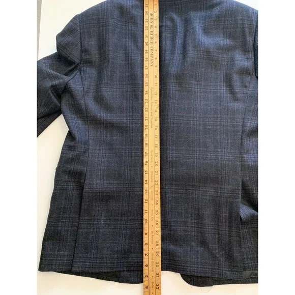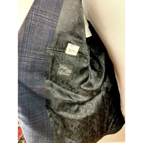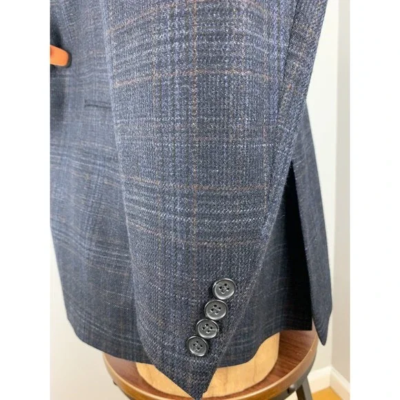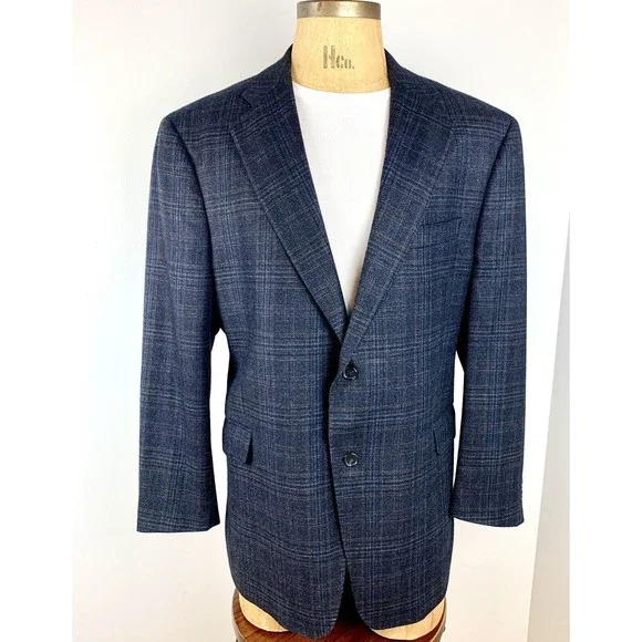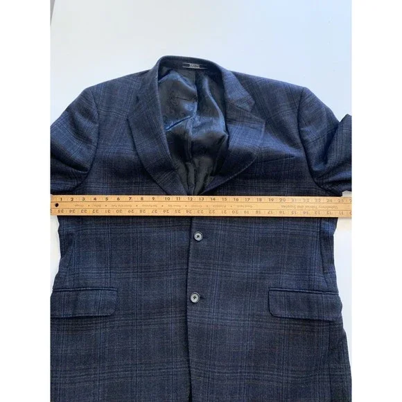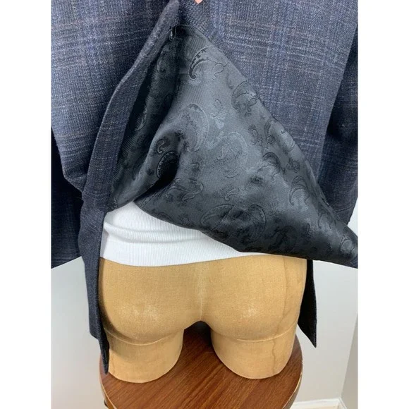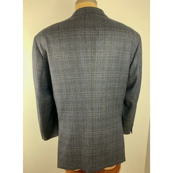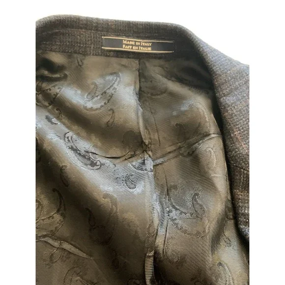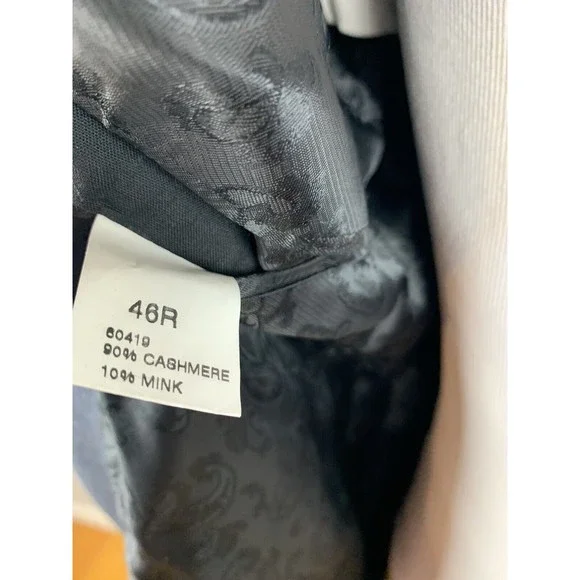 Size 46 R 90% Cashmere 10% mink sport coat Dark gray Notched collar Double vent Gorgeous Paisley lining The color in the first picture isnt an accurate depiction of the color. The suit is Dark gray with burgundy, black and gray plaid 2 button front 4 buttons on the sleeve Measurements taken laying flat Chest 24.5 Length 31 Sleeve taken from shoulder to cuff 24.25 In excellent condition