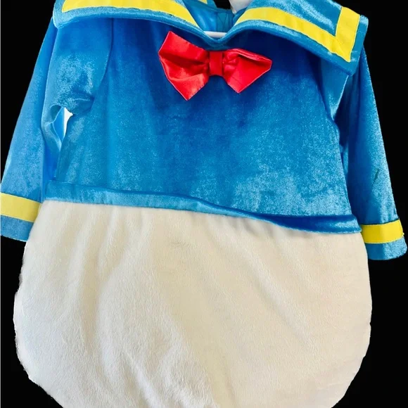 Donald Duck Original Limited Edition Disney Park Costume. It’s ultra-soft, plush with lots of Padding. Only worn once closet kept in excellent condition. Smoke free home… Includes one pair of Brand New yellow tights. Size 18-24months. Gender Neutral toddler costume. So adorable!! The head piece has a beak that squeaks. Velcro fasteners for head piece and on bottom of outfit for easy diaper changes or potty breaks. Bought in and was only available for limited time at Walt Disney Theme Parks. Great quality, made to last!! Could be sold again or passed down many times! Perfect for Disney trip or as Halloween costume. Original price $95