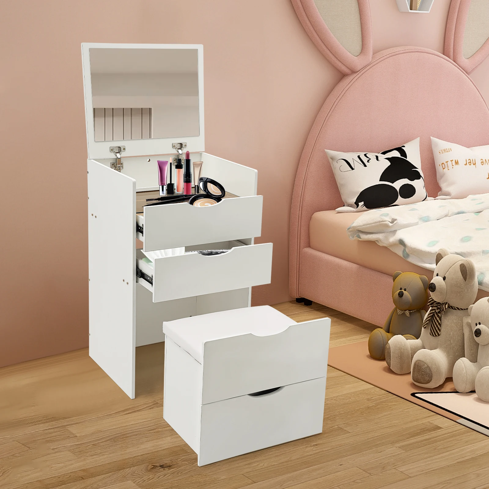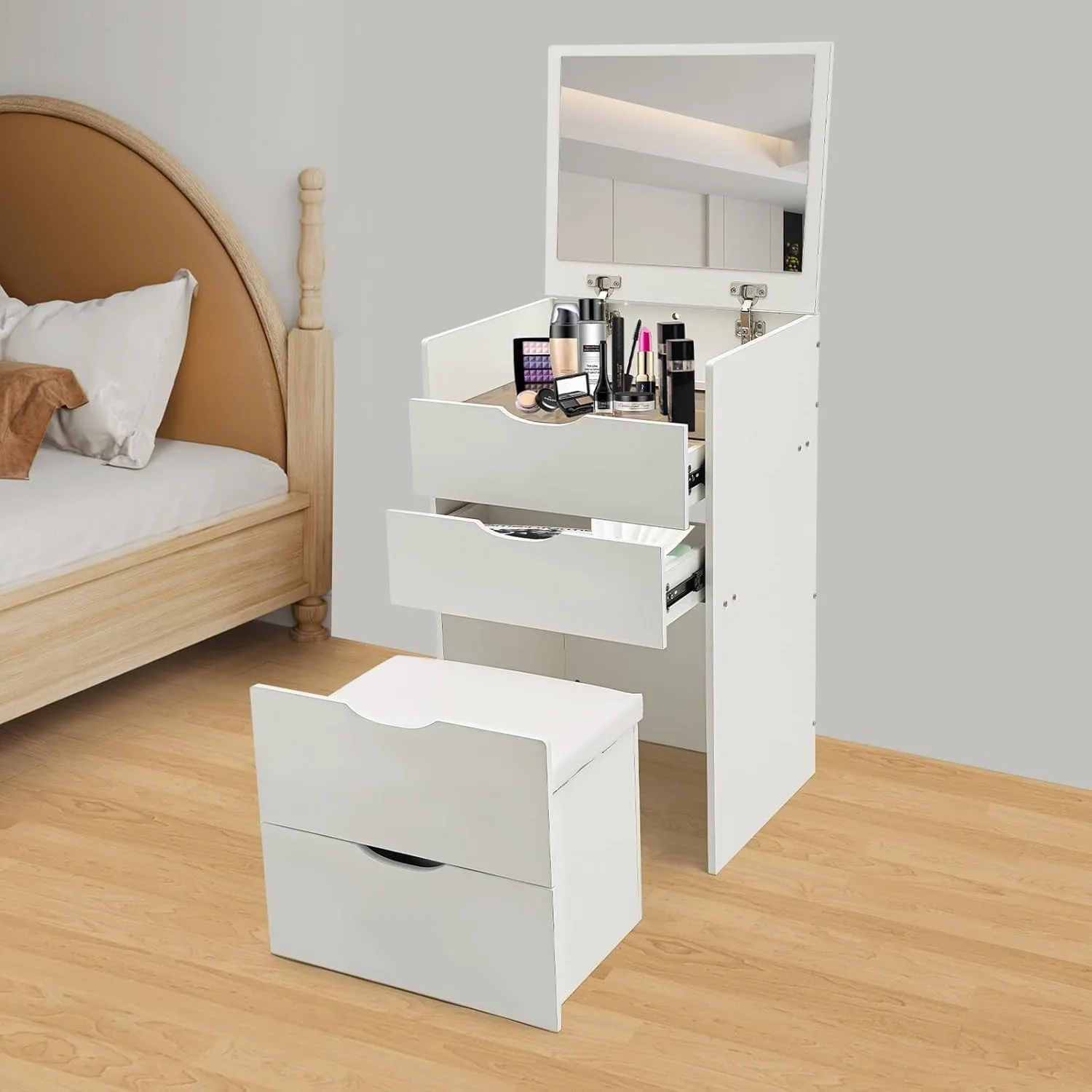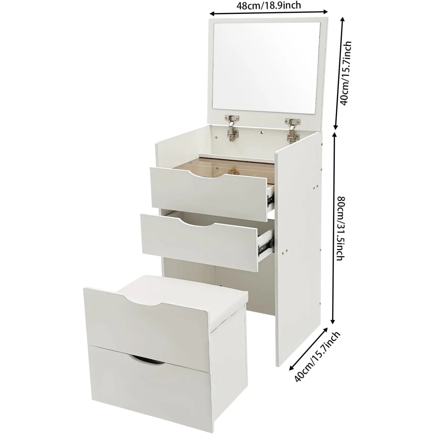 Ample Storage Space: This product comes with two drawers and a stool with a large storage drawer. When you flip the top of the desk, there is one more hidden storage space for you. You can keep your daily cosmetics and makeup tools such as eye shadows, perfumes, and brushes organized for a tidy living space and a convenient makeup process.