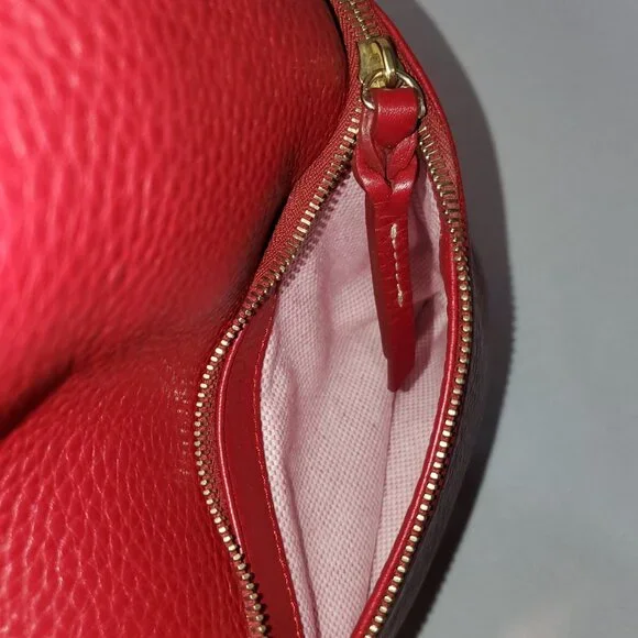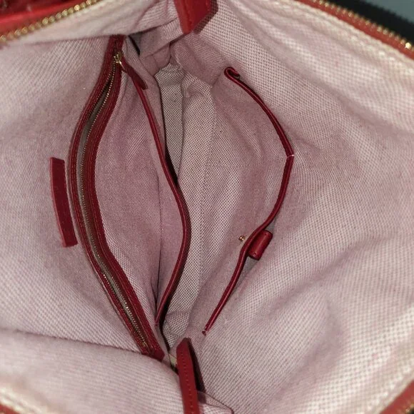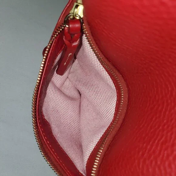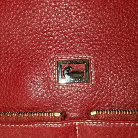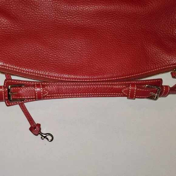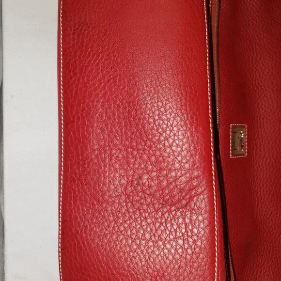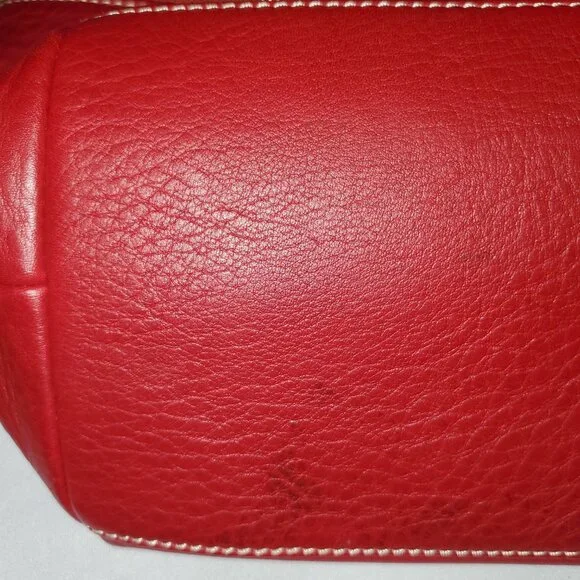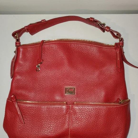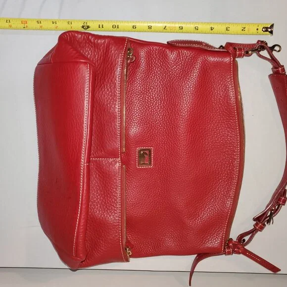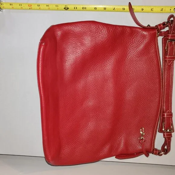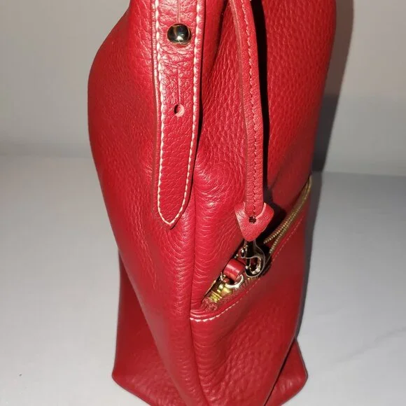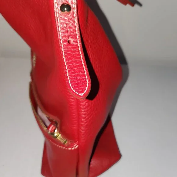 Authentic Dooney & Bourke genuine pebble leather shoulder bag. Spacious. Crafted from soft pebble leather. Many compartments to keep you organized. Features an elegant, yet effortlessly slouchy shape to exude a comfy-chic vibe. Deep, yet vibrant red color: Perfect for summer and fall accessorizing. Includes dust bag!Zipper closure.Adjustable shoulder strap. Strap drop length: 10.5".L 9.5" x W 5.5" x H 12"2 lbs., 5 oz.Two outside zip pockets.One inside zip pocket. Three interior slip pockets.Inside key hook.Lined.Metal plate logo.Minor staining on bottom of bag. See photos.