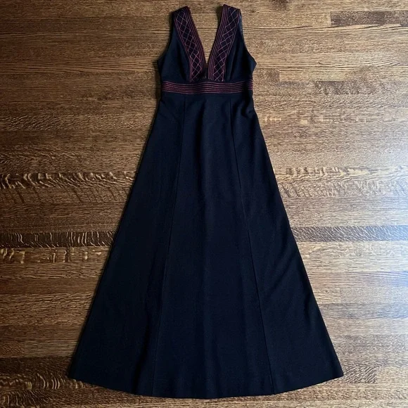 Incredible antique-style dress by vintage designer brand Young Edwardian. Made of a sturdy, surprisingly soft jet-black wool (the top is lined with satin, no part of the dress feels scratchy against my sensitive skin—) and simple red thread embroidery. Nicely structured, sleeveless, looks fantastic when paired with a flowing balloon-sleeve blouse underneath or shawl draped around the shoulders. Coordinated plunging neckline AND backline, smoothly functioning hidden zipper. Throw your best cloak over it, a giant necklace, and you’re ready for a spooky night at the Halloween Ball.In lovely, gently worn condition with no holes or tears. This dress appears to have been hemmed by hand, some sections have come unstitched and will either need to be sewn up again or completely undone if you’d like to restore the extra length 🖤Approximate measurements, taken laid flatPit to pit: just under 14inWaist: 12.5inLength: 51.5inTags: Victorian Edwardian Gothic Reproduction Minimalist Vampire Witch Wicca Wool Sorceress Desert Boho Southwestern Maxi Formal Ball Gown Costume Theater Historical Folk Cottagecore