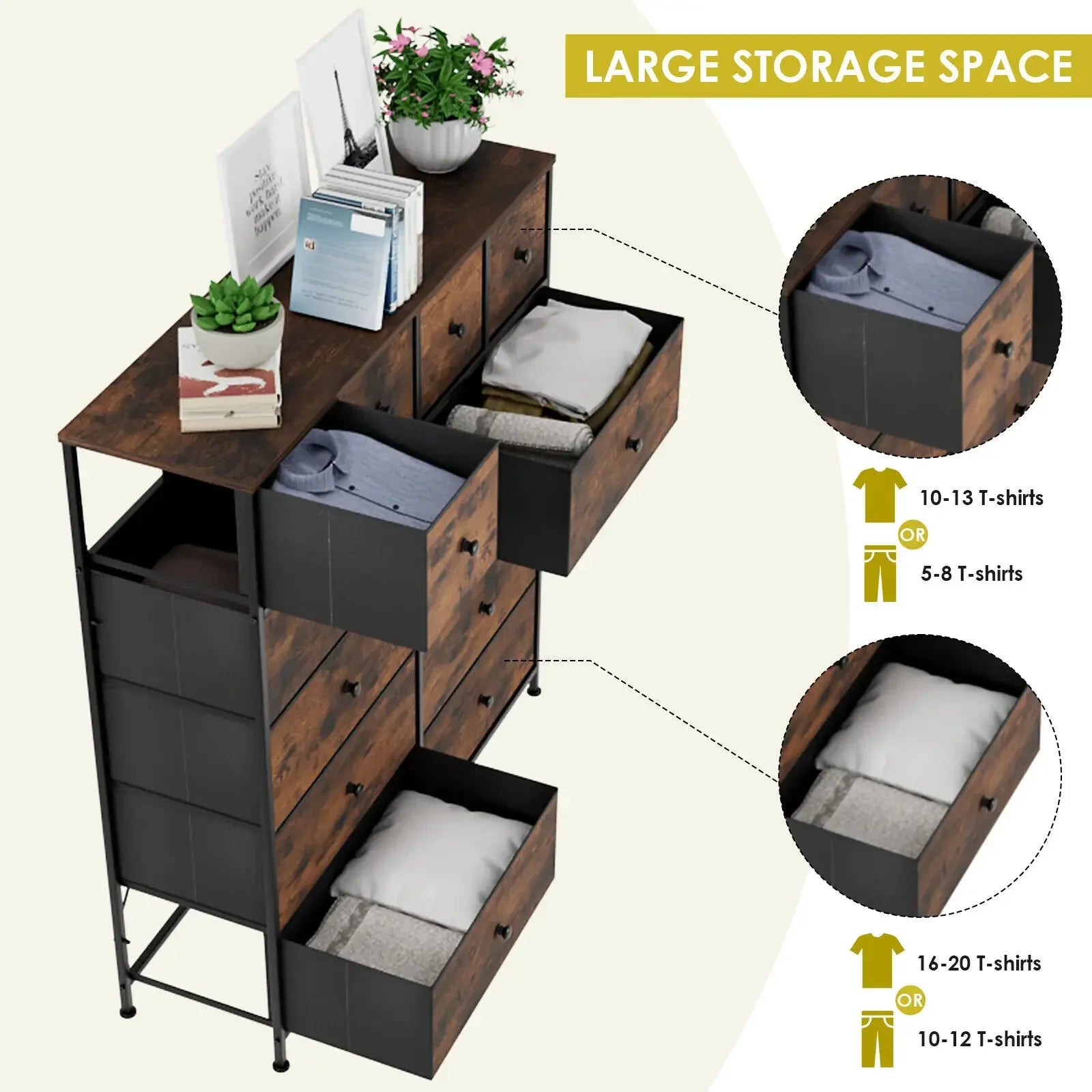 【EASY TO ASSEMBLE】Multi-level drawer dresser includes all needed accessories and hardware as well as instructions. We recommend: 1. Two people install at the same time. 2. For more time-saving and labor-saving installation, please use an electric screwdriver. Each drawer has a reinforced bottom panel that can be removed and the drawer folded when not in use.
