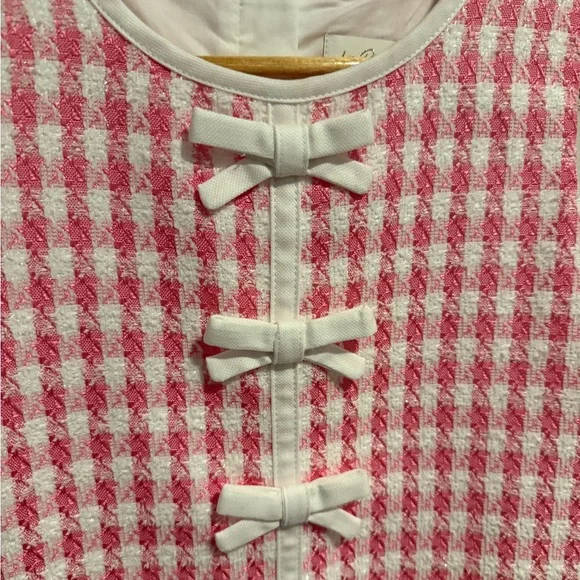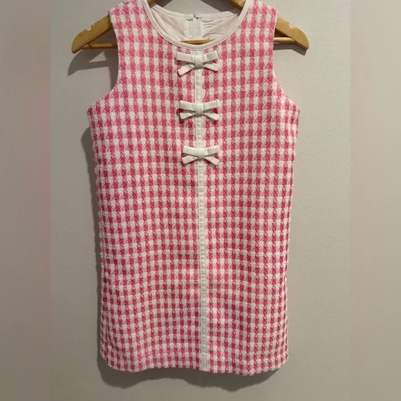 Excellent Lilly Pulitzer Girls Mini Aria Shift Dress | Size 14 | Pink & White Still on Lilly’s website - new style! This adorable Lilly Pulitzer Girls Mini Aria Shift Dress in a vibrant Pink & White color combination is the perfect addition to your little one’s wardrobe. Whether it's for a special occasion, family gathering, or day out in the sun, this dress brings both charm and comfort. Houndstooth and bows are the perfect combo! Features:A-Line Shift Dress: Classic, flattering cut for ease of movement and comfort.Sleeveless Design: Perfect for warmer days or layering with a cute cardigan.Front Bows & Band Details: Playful bow accents and a chic band add a touch of sweetness to the design.Back Zipper Closure: Easy to put on and take off with a secure fit.Fully Lined: Ensures comfort and quality, with a polished look.classic style, colorful—ideal for parties, family events, and vacations. Dress it up with shoes or keep it casual for any occasion. Elle woods boss babe church outfit brunch country club summer wedding party tween style preppy palm beach vibes