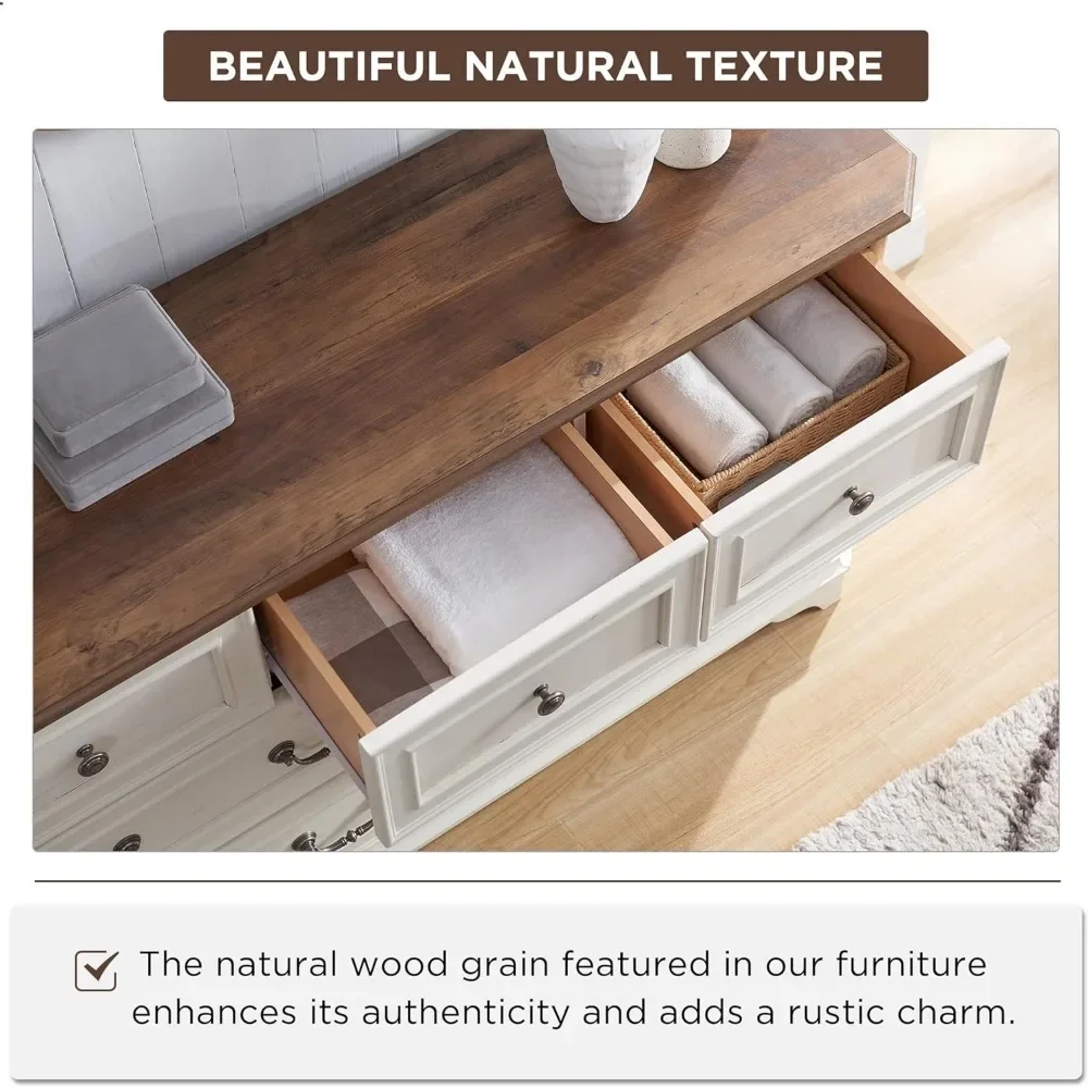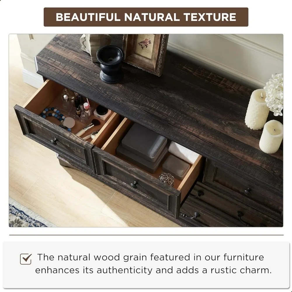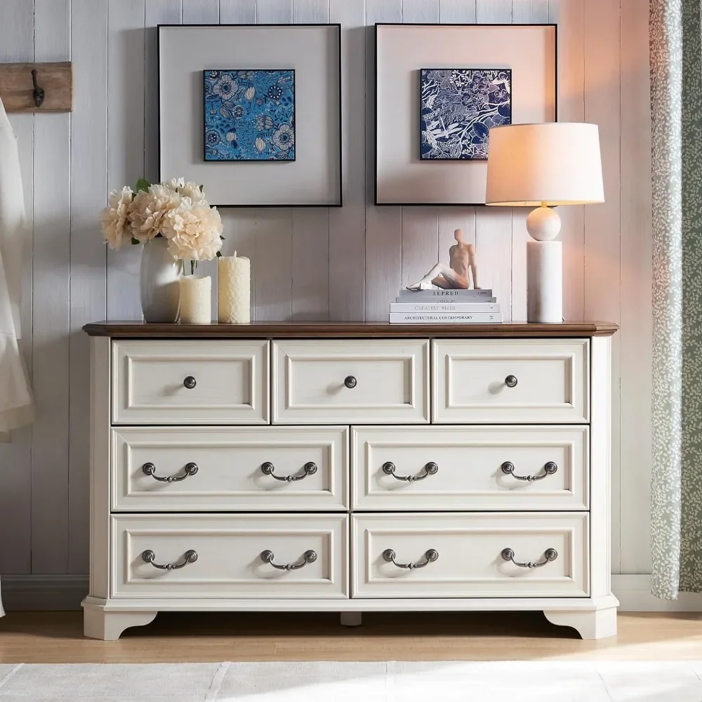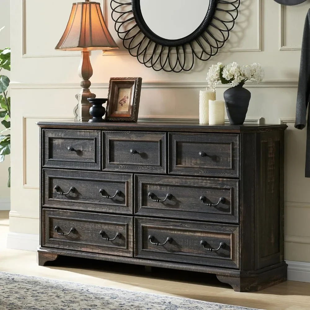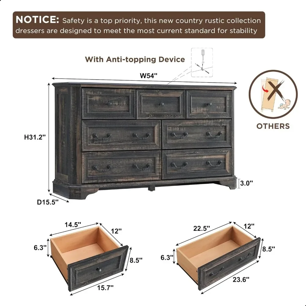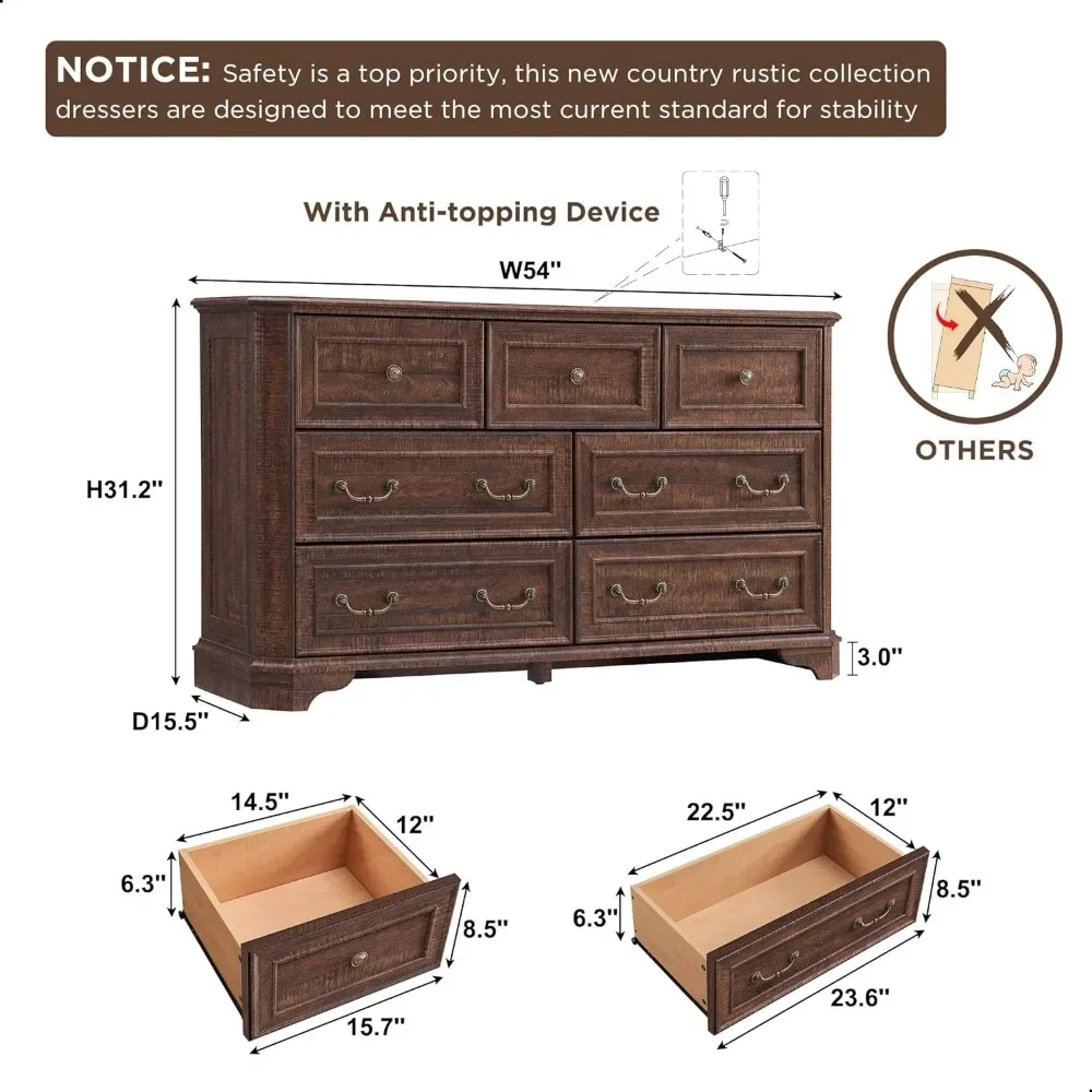 FARMHOUSE 7-DRAWER DRESSERS - The rustic charm of this dresser adds warmth and coziness to any bedroom, creating a welcoming atmosphere. The natural texture of the wood brings a sense of authenticity and character to your living space, while the vintage design adds a touch of nostalgia and style. With its wide width of 54", this dresser is perfect for adding a touch of farmhouse charm to any bedroom decor.