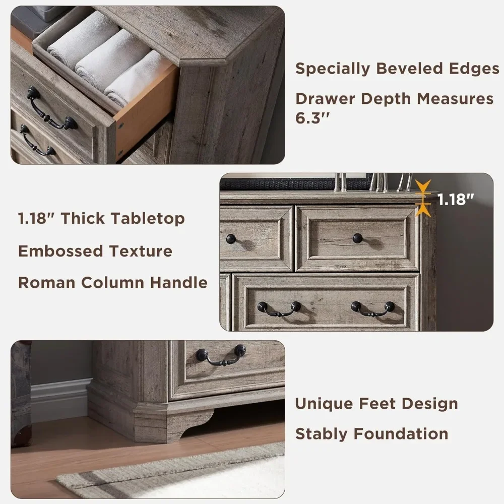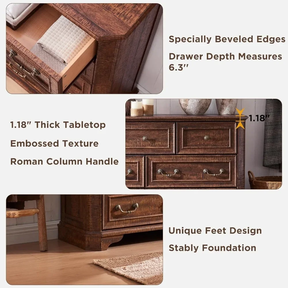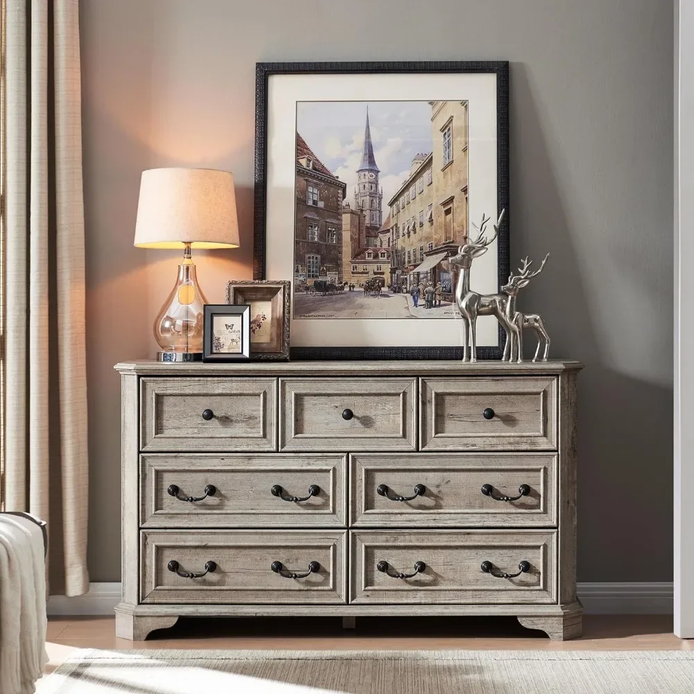 UNIQUE VINTAGE DESIGN DRESSERS - Embrace the beauty of vintage aesthetics with this 7-Drawers dresser. Designed with embossed textures and beveled edges on the furniture exterior, our dressers exude sophistication and elegance. The Roman column-style handle provides a classic finishing touch, making it the perfect storage solution for your bedroom essentials.