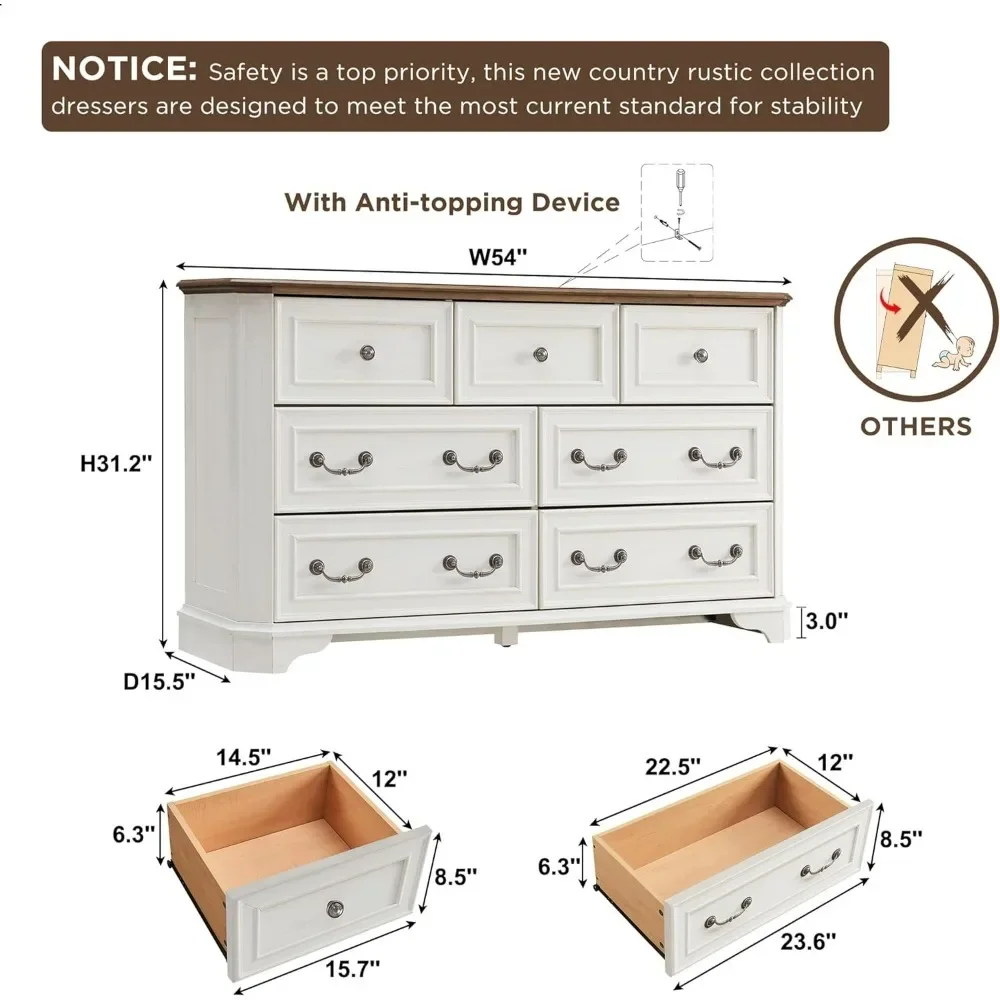 SATISFACTORY STORAGE CAPACITY - Measuring 54" W × 15.5"D × 31.2"H, this dressers feature 3 small drawers and 4 big drawers greatly added storage space to classify your home for socks, clothing, linens, cozy throw blankets, or pillows. Each drawer depth measures 6.3 inches, and can easily fit into any adult's clothes or cotton quilt. Its spacious tabletop serves as a stylish canvas to beautifully showcase framed photos, artistic accents, and more.