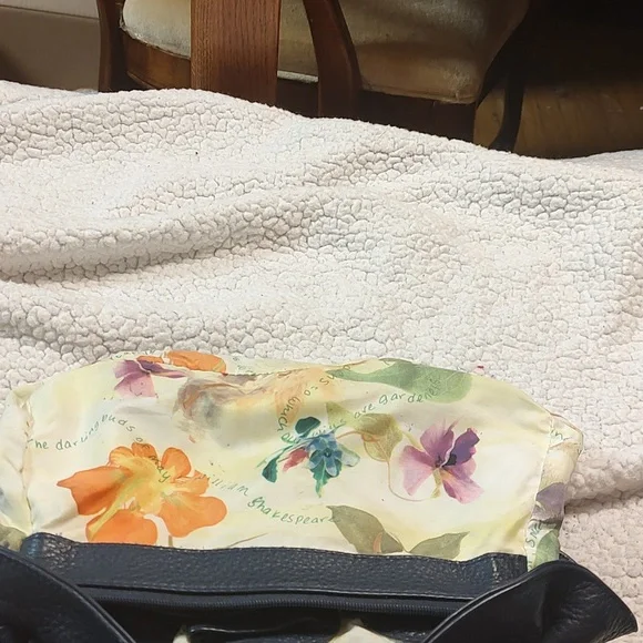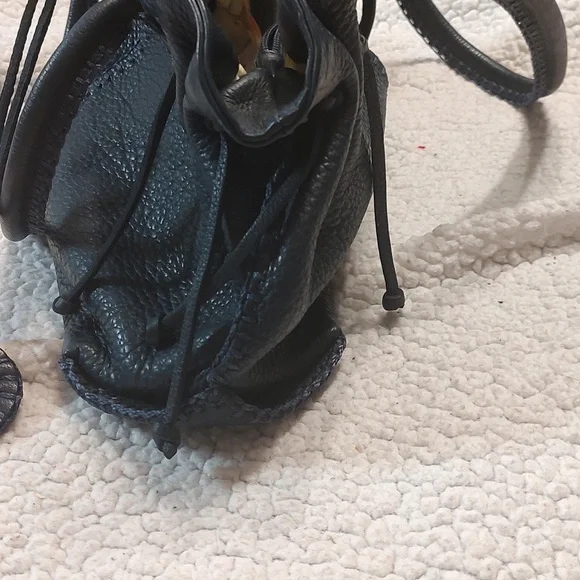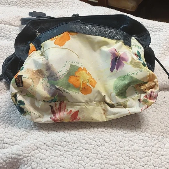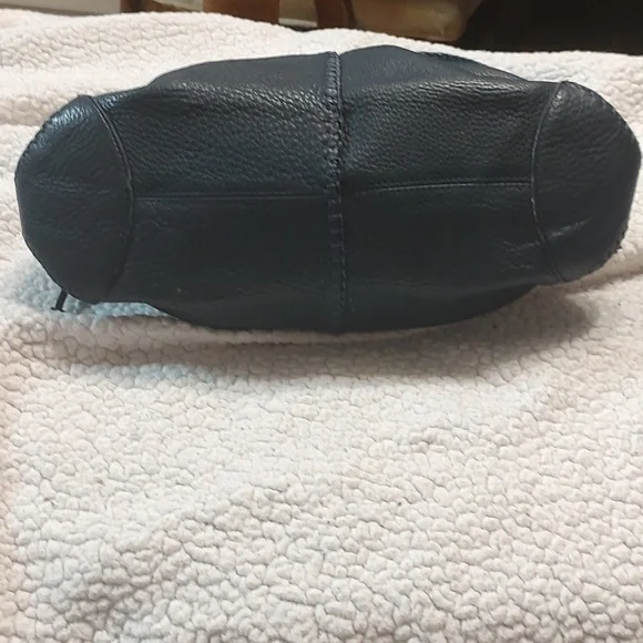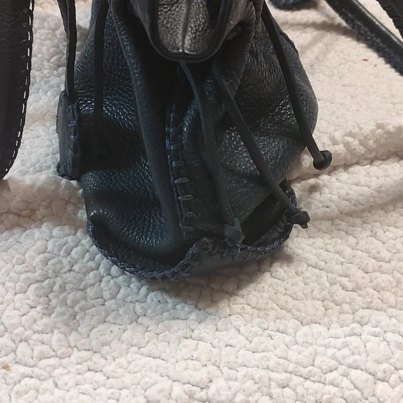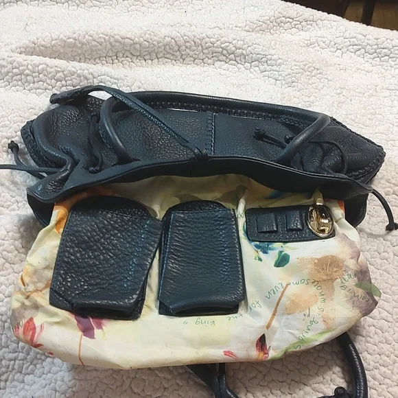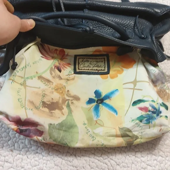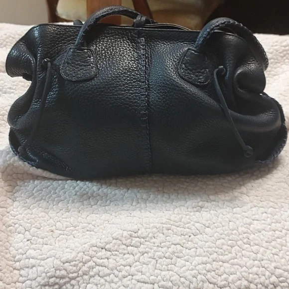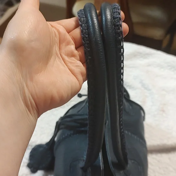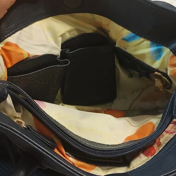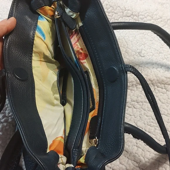 Preloved Fatto a Mano by Carlos Falchi shoulder bag satchel in dark navy blue pebble grained leather. Excellent used condition. Magnetic closure. Gold hardware. Whip stitched double rolled leather shoulder straps. Two interior zipper pockets. Features decorative leather tassels and exposed stitching.Floral print fabric lining. Leather exterior is in excellent condition. Call out: Interior lining has light, visible stains from normal use and wear. No rips or tears to bag exterior or interior. Please note that this is a pre-loved item and may show signs of wear and use. Odor from storage or use may be present. Will use natural deodorizer spray before shipping but it may not remove odor completely.Please review all photos and listing description carefully before purchase, and ask questions. Purse measures approximately13 inches across by 8 inches high and 4 inches wide. Double rolled handles shoulder strap drop is approximately 8 inches. Purse is coming from Smoke free and cat friendly home.Accepting offers!