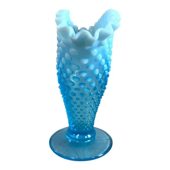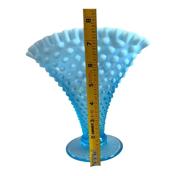 Enhance your home decor with this stunning Fenton Blue Opalescent Hobnail Vase. Its elegant fan shape and vibrant hues create a captivating centerpiece.• Measures 7.75”tall• Features hobnail texture• Crafted with opalescent glass• Unique fan-shaped design• Sturdy round base for stabilityNo visible flaws. Top to bottom = 7.75 inches.