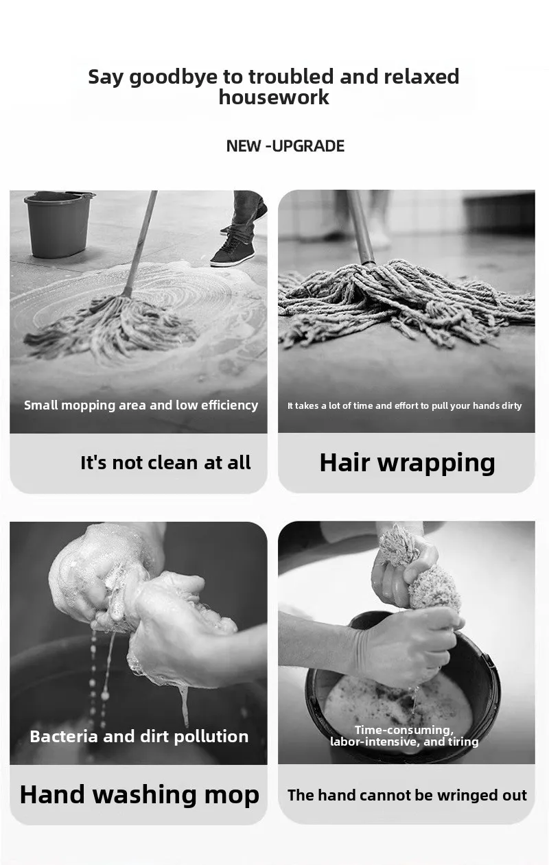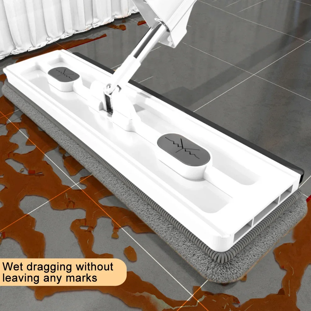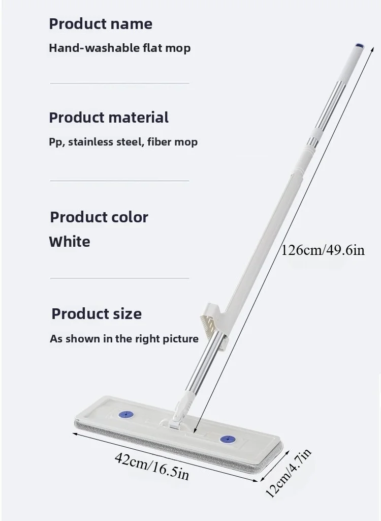 1. Mop with Squeeze Function: The large flat mop comes with a squeeze function that allows users to stand the mop upright and use the scraper device on the handle to squeeze out excess water multiple times. This feature helps remove hair and dust from the mop head without directly touching it with hands, ensuring a more hygienic cleaning experience. 2. 360° Flexible Mop Head for Easy Cleaning: The wet and dry mop features a flexible 360° rotating joint, making it easy to reach corners and effectively remove dust and dirt. It ensures thorough cleaning without leaving any dead angles or hard-to-reach spots. This versatility makes it good choice for cleaning homes, kitchens, offices, bathrooms, and more. 3. Extendable Stainless Steel Handle: The stainless steel handle of this floor mop set is extendable and consists of three sections, providing a total length of 137cm. The long handle is suitable for most people's height, reducing the frequency of bending and squatting. 4. Ultra-Fine Fiber Mop Pads: The tile floor mop comes with ultra-fine fiber pads (one already installed), which are reusable, easy to replace, and cost-effective. These pads have strong water absorption and excellent dirt removal capabilities. They can be used for both wet and dry cleaning, effectively removing grime, hair, and dust. 5. Multi-Purpose Usage for Various Floors: This hardwood floor mop is suitable for various types of floors, thanks to its high-quality construction. It works well on most hard floors, including tiles, wood, laminate, resin, and more. Its versatility ensures that you can meet your specific cleaning needs in different situations. Specification: Origin: Mainland China Material: Microfibre Fabric Wringing Method: Sliding Type Mophead Quantity: 1 Handle Type: Extensible Feature: Stocked,Eco-Friendly Shape: Rectangle Type: Flat Mops Color: White Material: PP + Stainless Steel + Fiber Cotton Size: Panel 42x12cm / 16.53x4.72inch, Pole Length 162cm / 49.6inch Product List: 1 Mop + 2/6 Replacement Cloths,1 Mop + 2Replacement Cloths + folding bucket Note: ![]() ![]() ![]() ![]() ![]() ![]() ![]() ![]() ![]() ![]() ![]() ![]() ![]() ![]() ![]()