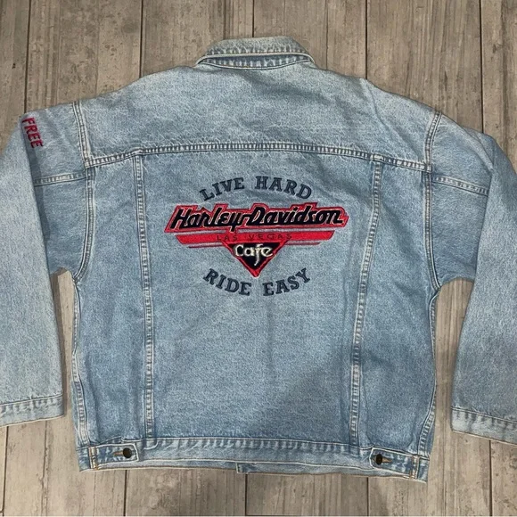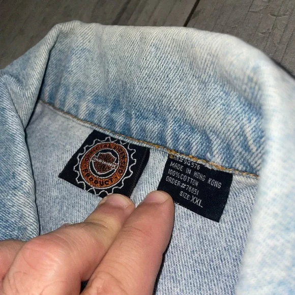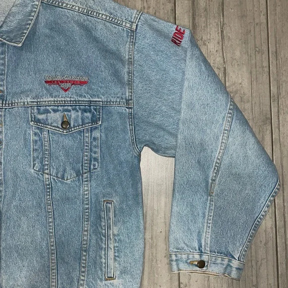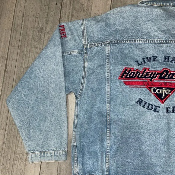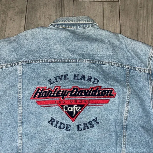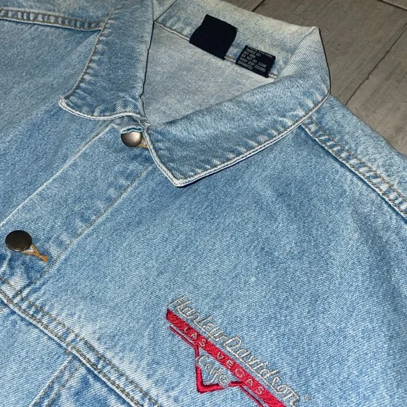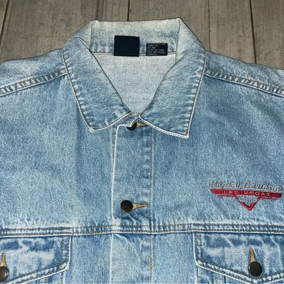 This Harley-Davidson Men's Jacket, size 2XL, is made of high-quality denim and features an embroidered logo. The jacket has a mid-length and a button-down closure, with a solid blue color that adds to its appeal. The outer shell material is made of cotton, and the lining is also made of cotton.This jacket is perfect for motorcycle enthusiasts, as it features a biker style and a motorcycle theme. It has pockets for convenience and can be worn in all seasons, including winter, summer, fall, and spring. It is a pre-owned item that was used in Las Vegas, with a regular fit and size type. Get ready to hit the road in style with this Harley-Davidson jacket. Ship usps