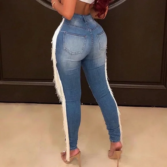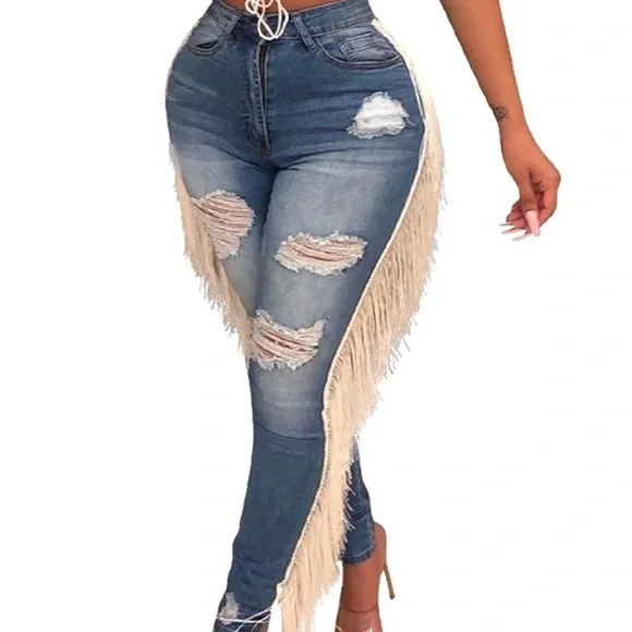 Women's Tassel High Waisted Ripped Skinny Jeans Distressed Destroyed Long Fringe Denim Pants Hip Hop StreetwearStylish blue jeans featuring fringe details and distressed accents. Perfect for a trendy look. Wash: Hand wash separately in cold water. Hang dry. Do not bleach. Do not tumble dryMaterial: Polyester + Spandex, elastic, light weight, feel and wear very soft, very skin-friendly and comfortable to wearSizing displayed in images DM if you need other sizing measurements 💕First time shopping on ? Use code GOODTWILL and get $10 OFF your first order!