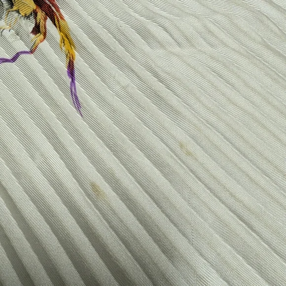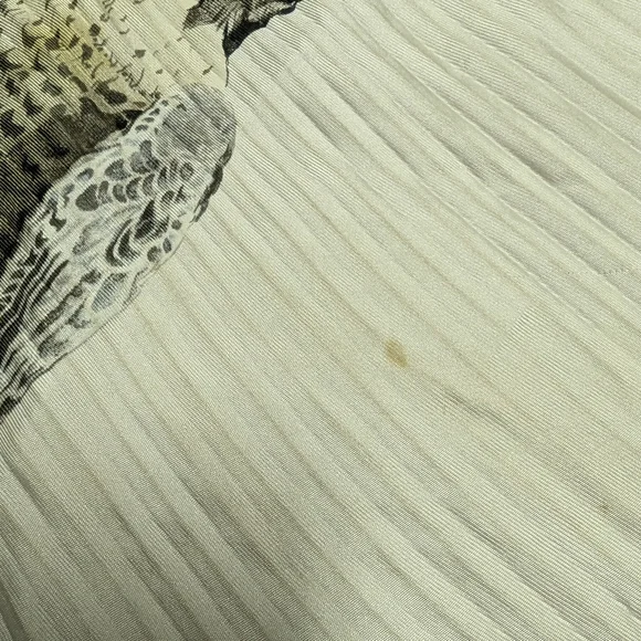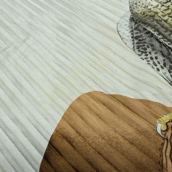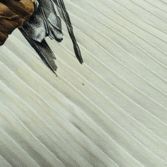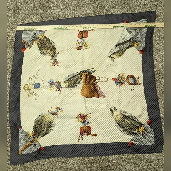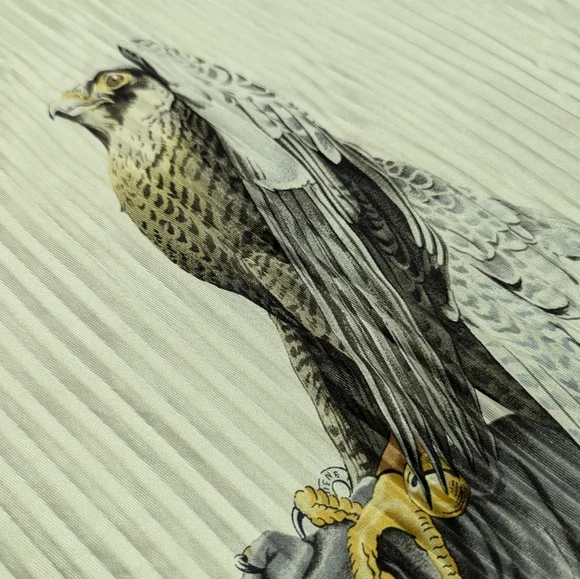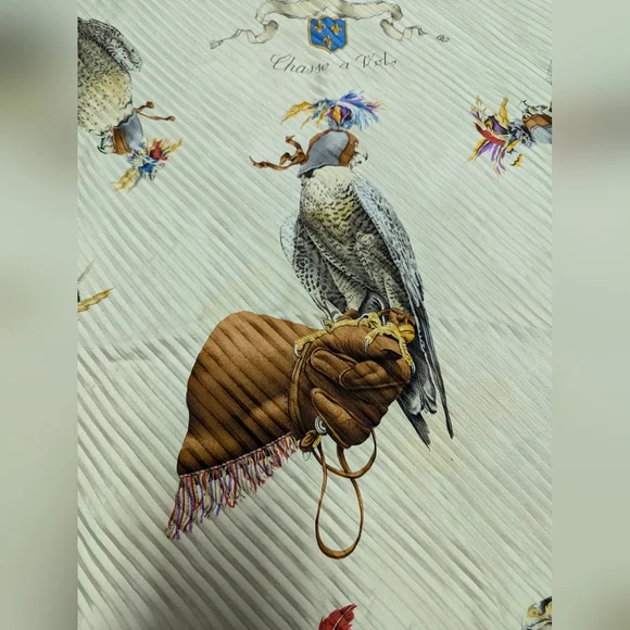 Stunning "birds of prey" vintage pleated scarf. He does have some stains and marks and pin holes but the holes are just that... pin holes. No tears! Can you imagine the pin that was used or brooch used to pin and? and what person wore it?! Amazing to think about... 🤔33"-34"The image shows a vintage Hermès "Chasse a Vol" silk scarf. It features a print of falcons in beige, brown, and golden shades against an off-white background, bordered by gray. The scarf is designed by Henri de Linares and is in very good vintage condition. Key details: Design: "Chasse a Vol" (Hunting Flight) featuring falcons.Artist: Henri de Linares.Material: 100% silk or silk and cashmere.Color Scheme: Multicolored falcons on off-white with a gray border.Dimensions: Typically 90x90 cm (about 35x35 inches).Condition: Vintage, with some minor signs of wear possible.Authenticity: Marked "HERMÈS-PARIS".