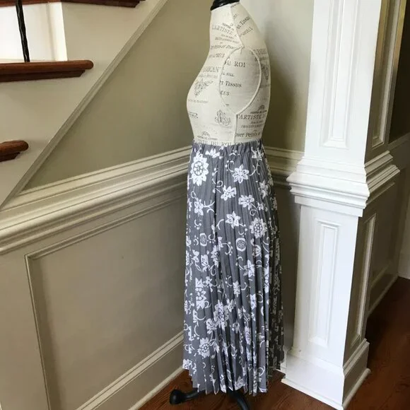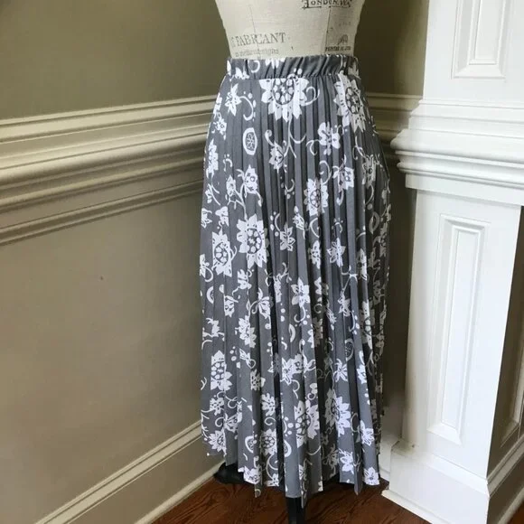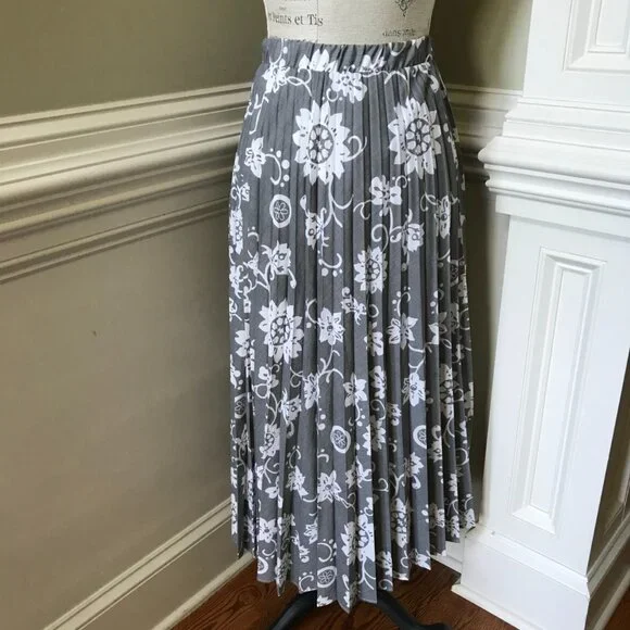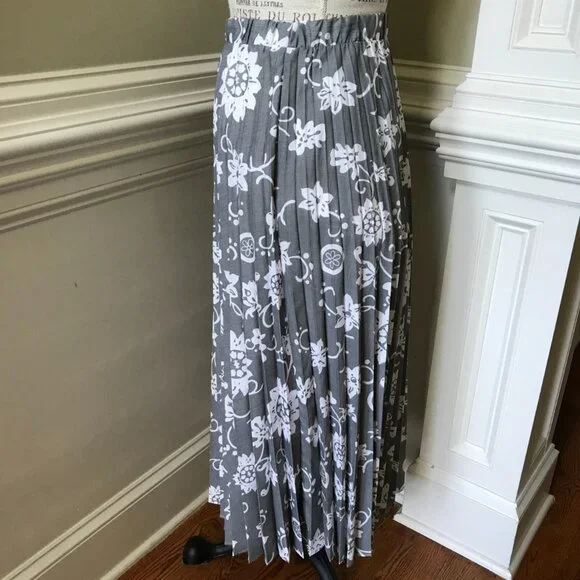 Hubert Gasser Pleated Midi Skirt Womens 46 Large Gray White Floral Elastic Waist