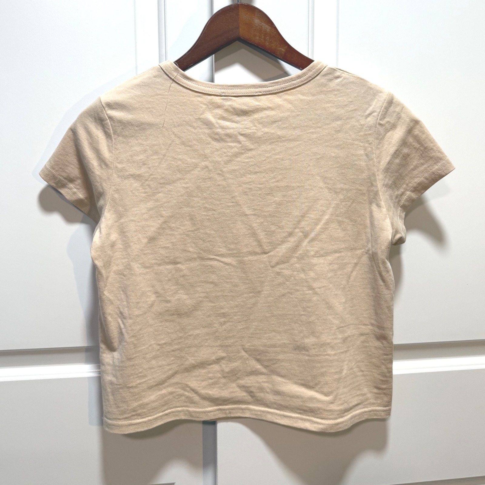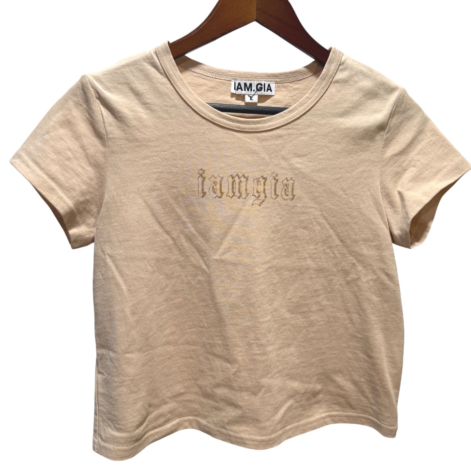 Stylish Iamgia crop top, perfect for adding a touch of edgy flair to any outfit. This short-sleeve t-shirt features a unique gothic-style logo across the chest, giving it a distinctive and trendy look. The neutral beige color makes it versatile and easy to