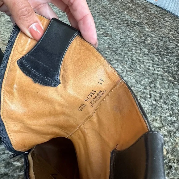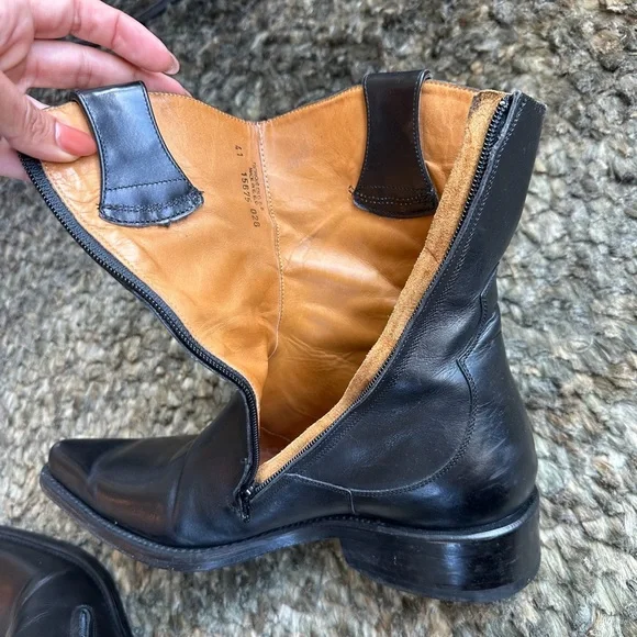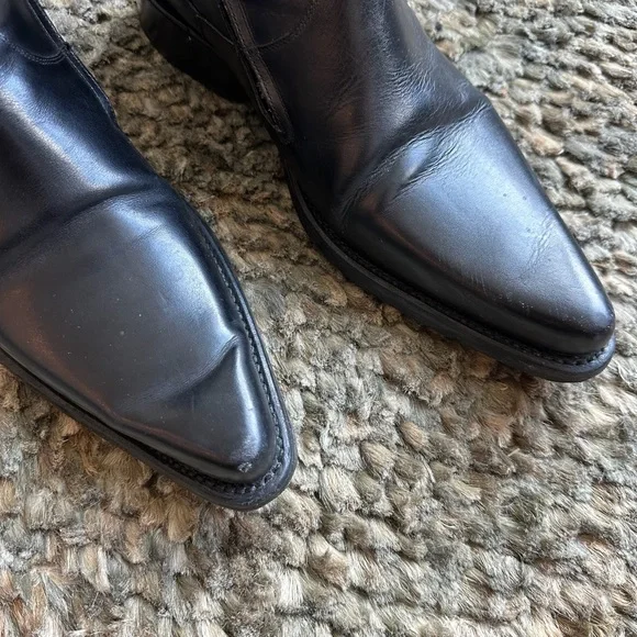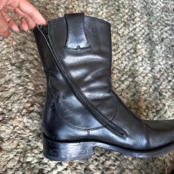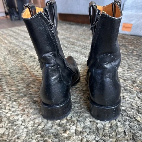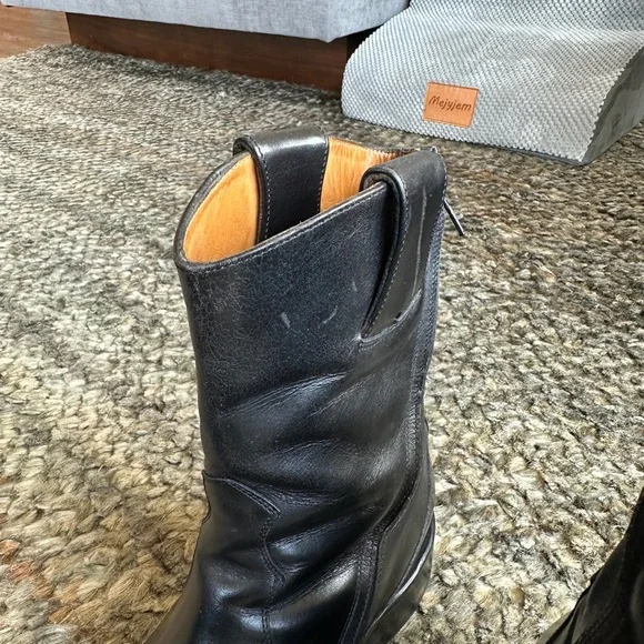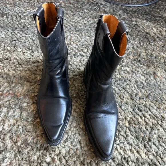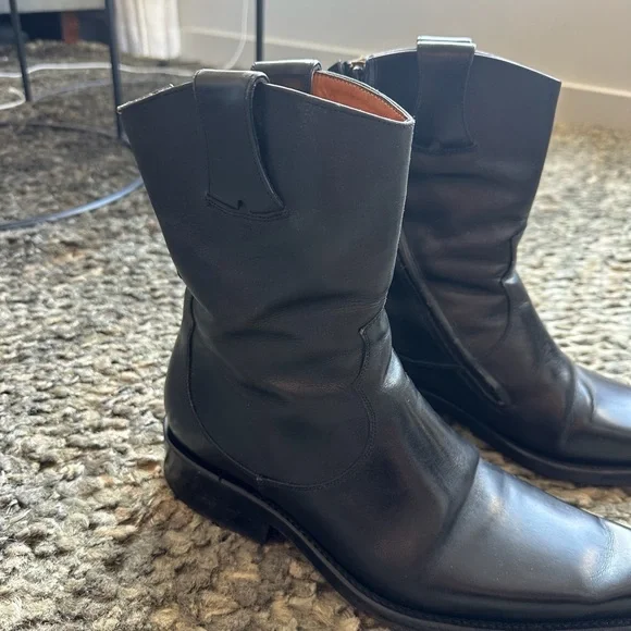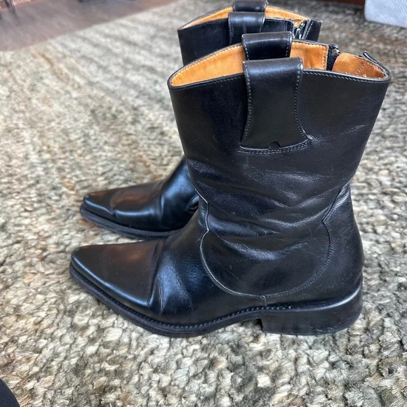 These black leather boots feature a classic western design with a pointed toe and mid-calf height. Crafted from high-quality leather, they offer a sleek and polished finish, perfect for both casual and dressier occasionJEAN BAPTISTE RAUTUREAU LEATHER WESTERN BOOTSSize: 41Cond: Very Good- Open for offers 😌