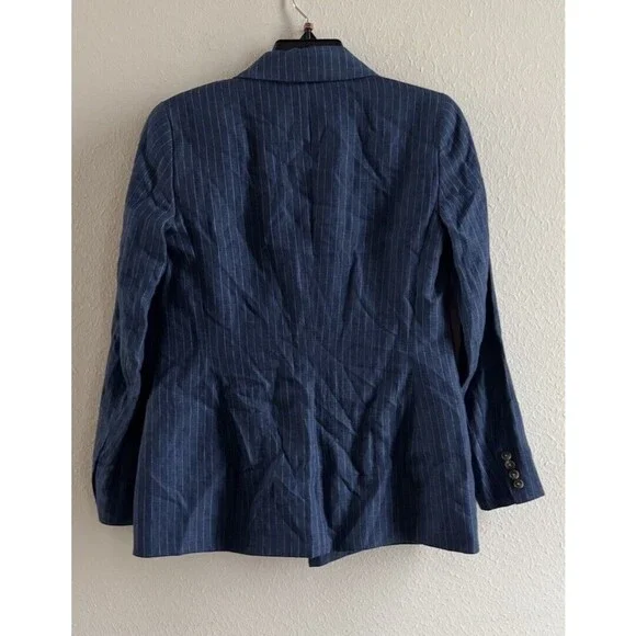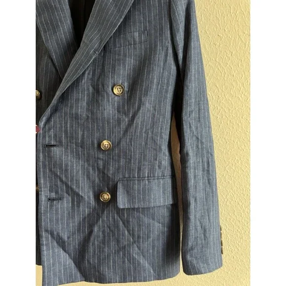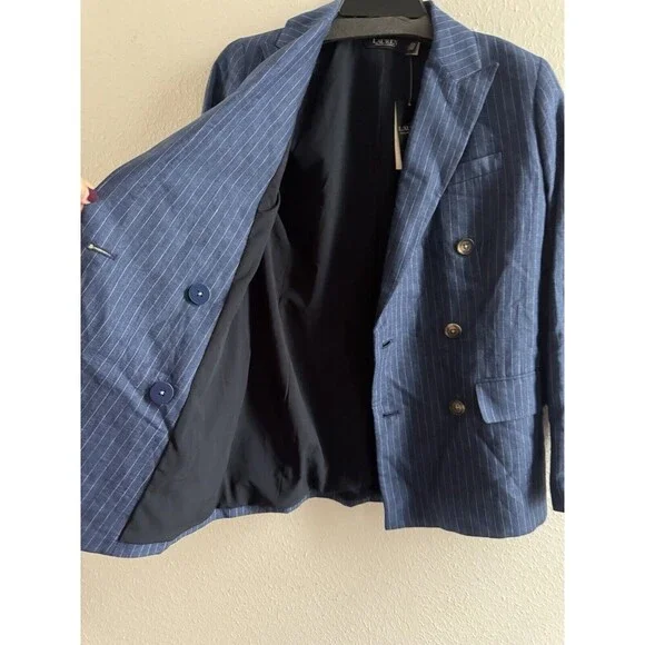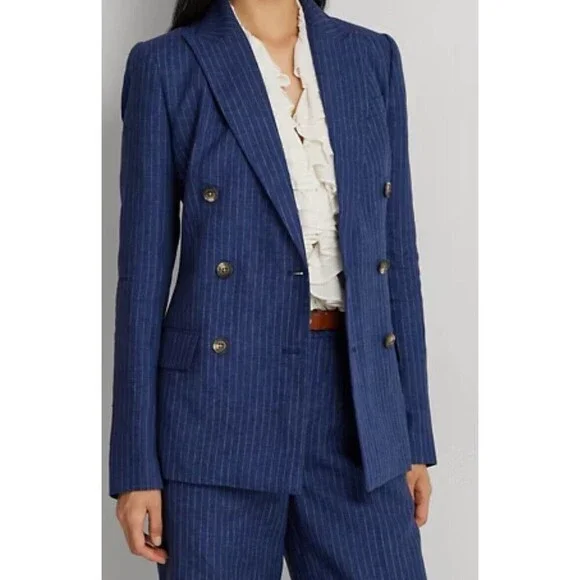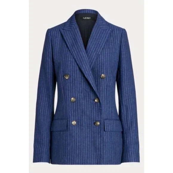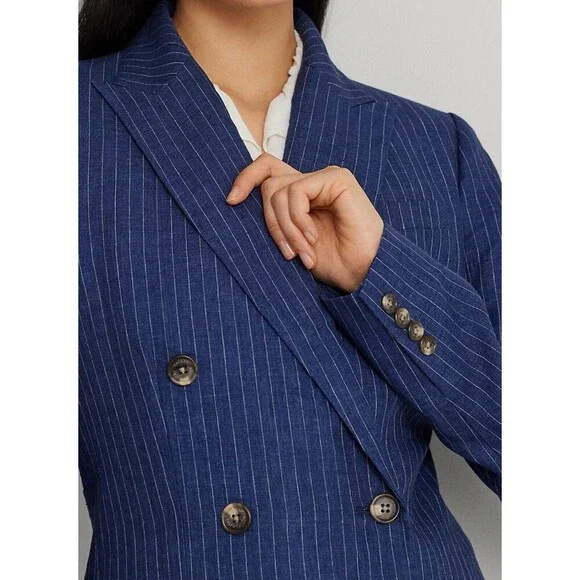A timeless essential, this blazer is thoughtfully tailored with lightweight linen thats been yarn-dyed with slender pinstripes. A double-breasted silhouette, princess seams, and peak lapels amplify its refined appeal.sizes available:**size 2 : bust 34''/ sleeves 23''/ length 27''/ shoulder width15.25"**size 14 Bust 42''/sleeves 25''/ length 30''/ shoulder width 17''**size 16 Bust 43'' /sleeves 25''/ length 30''/ shoulder width 17.5''DetailsStraight fit. Intended to hit at the lower hip.Peak lapels. Double-breasted silhouette. "Lauren Ralph Lauren"engraved horn-effect buttons.Long sleeves with four-button cuffs. Shoulder pads. Two front waist flapped pockets. Left chest angled welt pocket. "Lauren Ralph Lauren"engraved horn-effect buttons.Front waist darts. Front and back princess seams.Fully lined.Shell: 100% linen. Lining: 94% polyester, 6% elastane.Machine washable or dry clean. Imported.Prior to making your purchase, we kindly ask that you thoroughly review all accompanying photos, as they serve as the most comprehensive description of the item.Your satisfaction is our priority, and we strive to ensure a seamless shopping experience.Please feel free to ask any questions.Fast shipping (same business day)
