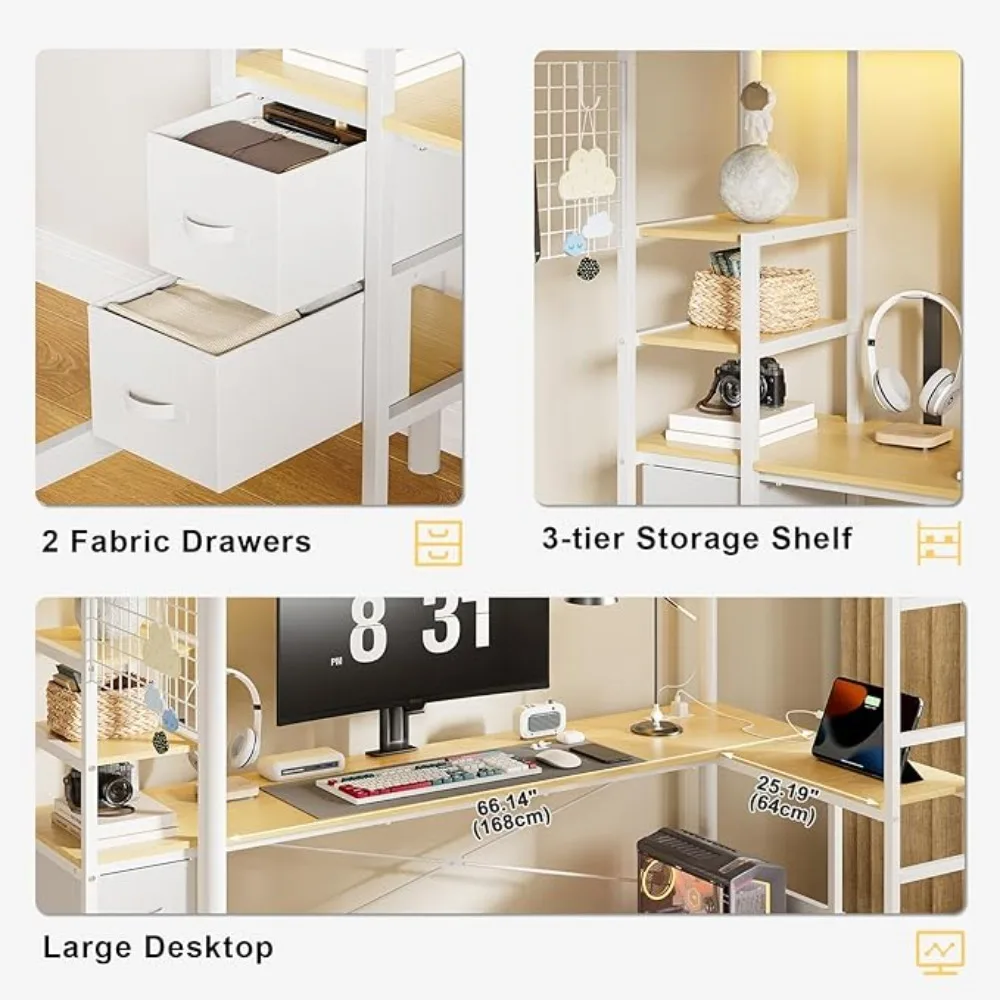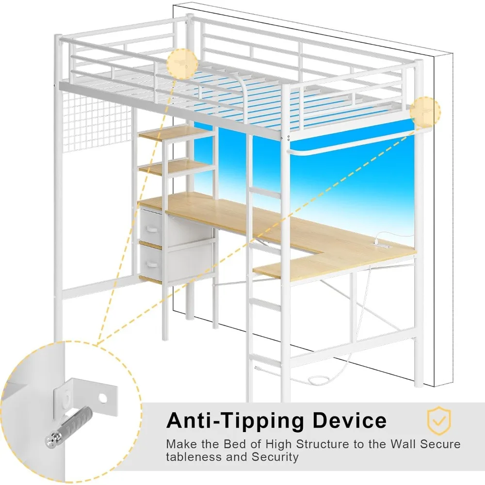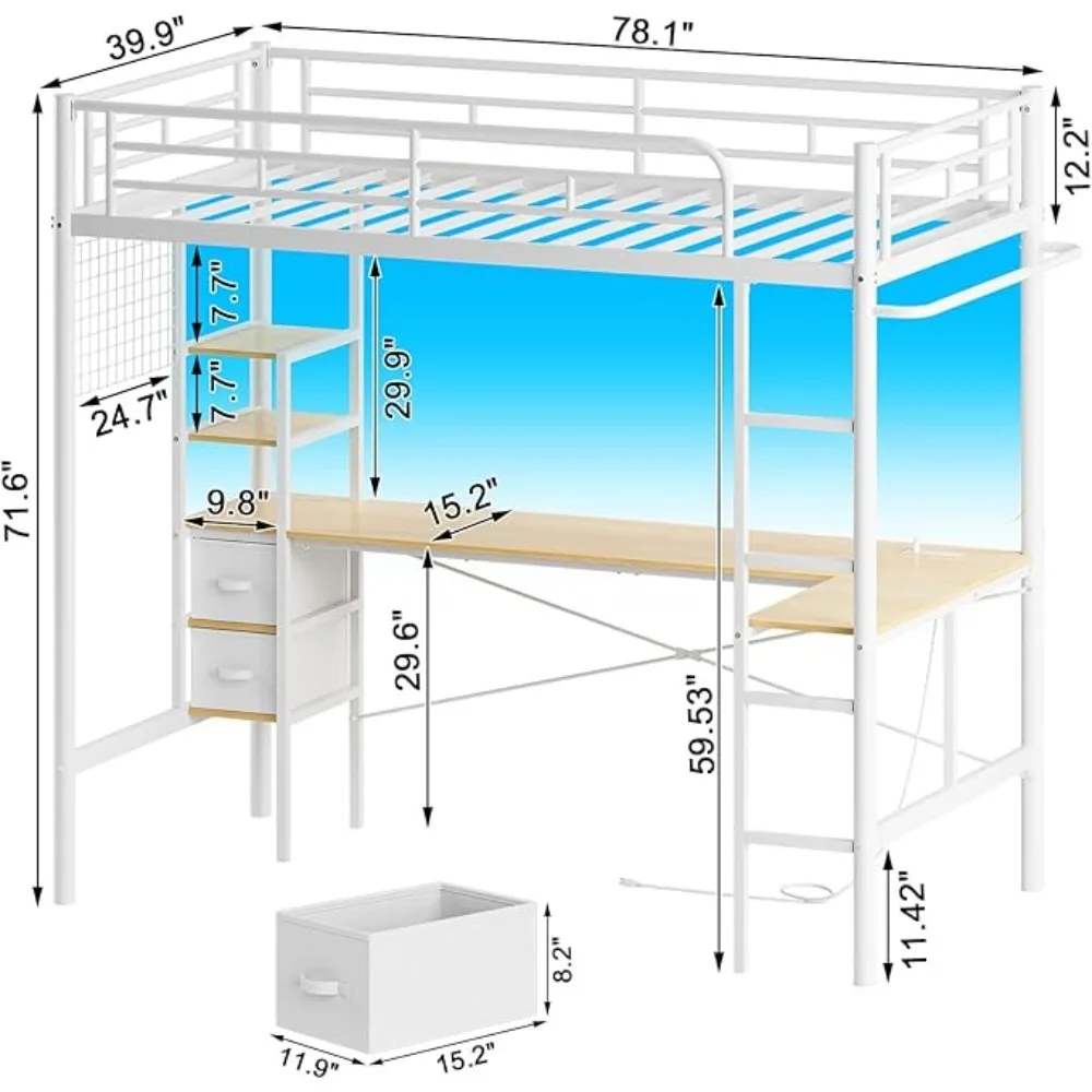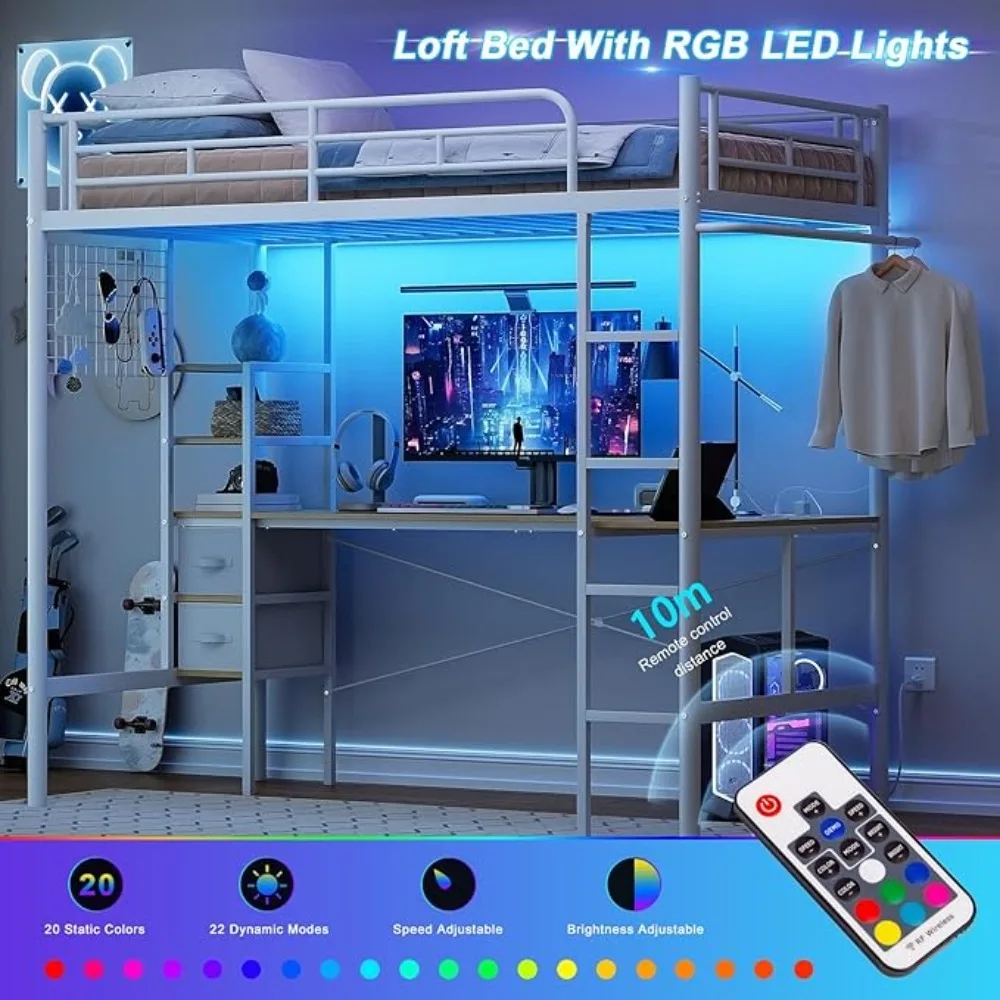 - LED and charging station: The LED lights on the loft bed emit cool lights that can create your favorite bedroom atmosphere. The charging station on the table comes with USB and AC sockets, allowing you to power your devices while working or playing games effortlessly