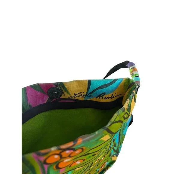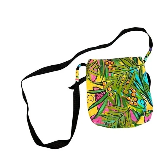 This one-of-a-kind crossbody handbag by Linda Rovolis is a true work of art. The bag is hand painted with a beautiful floral pattern on faux leather exterior, giving it a unique and stylish look. The bag is perfect for any occasion, whether it's a wedding or a casual day out.The bag has a black nylon handle/strap and is lined with green polyester, adding to its overall aesthetic. It has a small size of 8"x9" and is perfect for travel or workwear. This handmade bag is signed by the artist and is sure to be a standout accessory for any outfit.One of a kind artist signed workBin 19