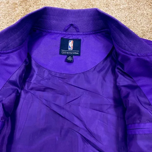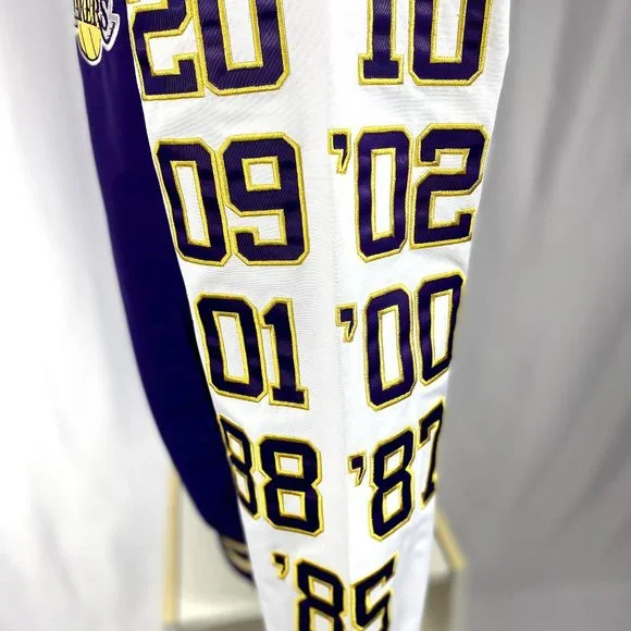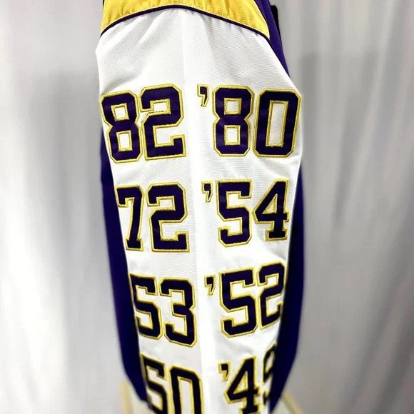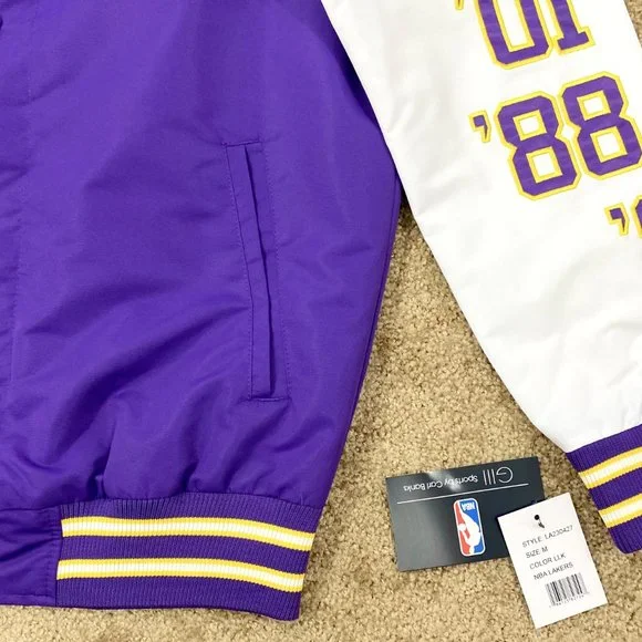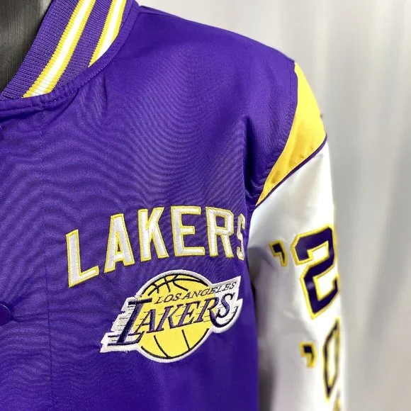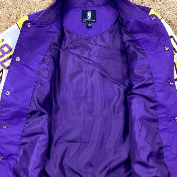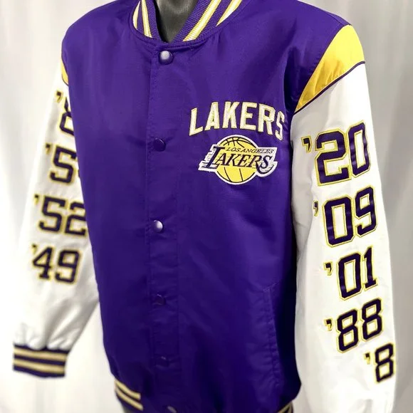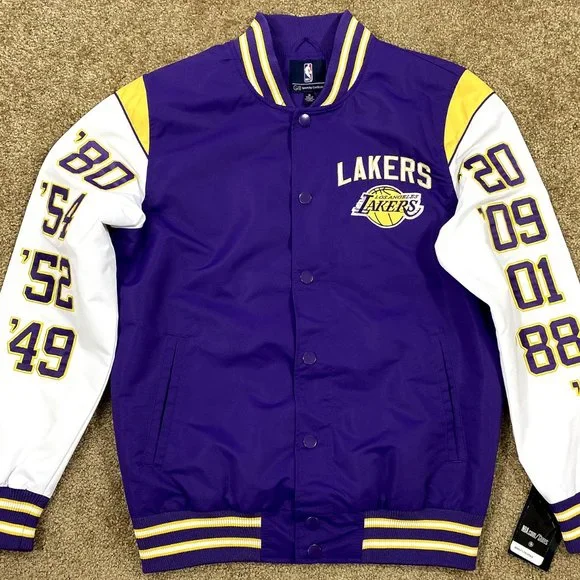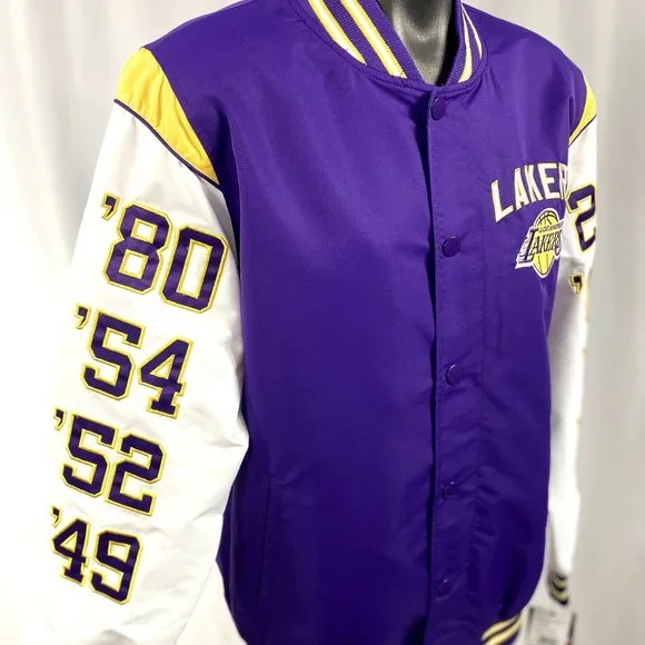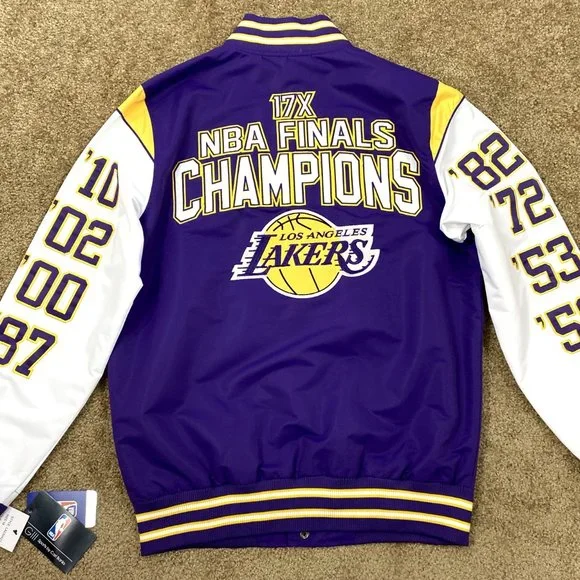 SPRING Big Man's 5X. New Arrival LOS ANGELES LAKERS 17 TIME NBA FINALS WORLD CHAMPIONS JACKET. Polyester jacket w/ sewn YEARS THE LAKERS WON THEIR CHAMPIONSHIPS on the on the sleeves. Solid PURPL color Body of the jacket with WHITE Sleeves that have CHAMPIONSHIP YEARS sewn into the sleeves.This is a SPRING polyester jacket that is not poly-filled.The jacket has 2 exterior pockets & 2 interior pockets at the Chest level. Inside lining is smooth soft polyester. All the logos are meticulously sewn on. Jacket has a tightly ribbed nylon collar, cuffs & waistline. Measurements armpit to armpit " 3X: 29", 4X: 31, 5X: 33"Top of Collar to Waist: 34".This jacket is a Medium weight jacket and it's not poly-filled.Really well made with all Sewn Logos, Letters & Numbers.