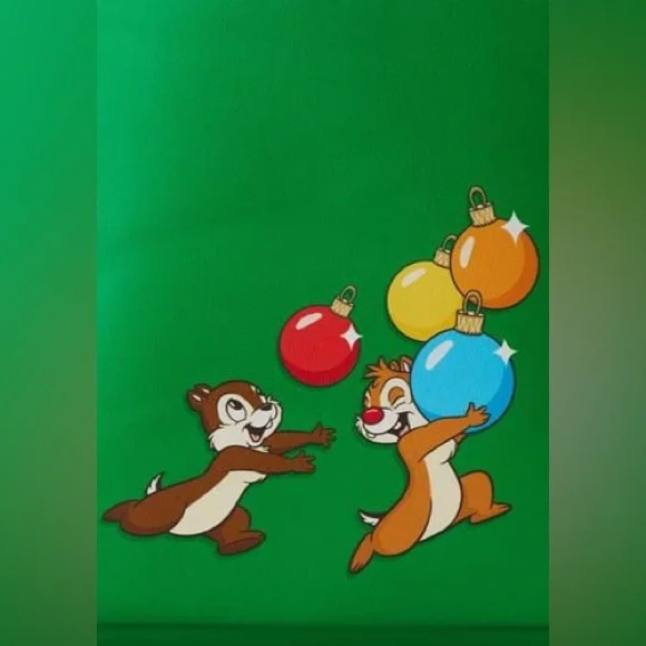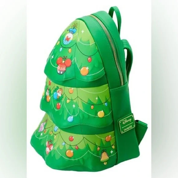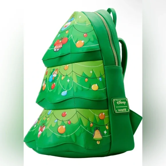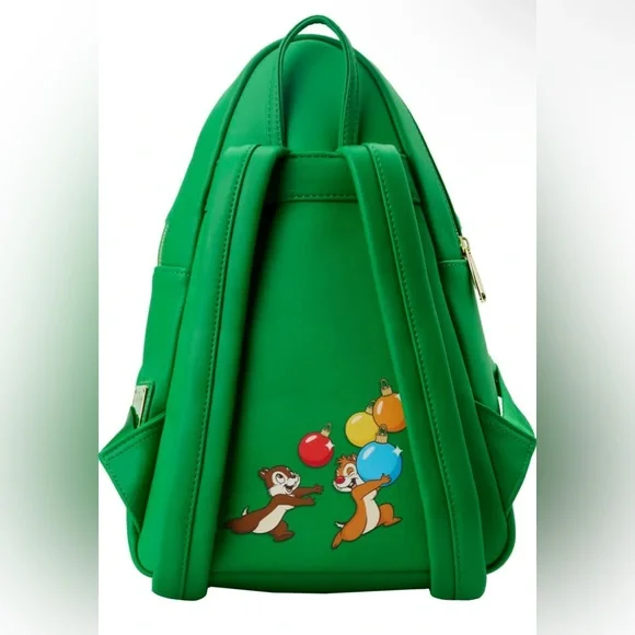 Tree-trimming is now even merrier with an adorable duo that’s got your back. Branch out in festive, holiday style with this Loungefly Disney Chip and Dale Tree Ornament Figural Backpack. Embossed and applique details bring Chip and Dale and garlands to life on this figural backpack, which is shaped like a holiday tree. Within the green branches, you might recognize the following Disney pals as ornaments: Minnie Mouse with her red and white polka dotted ears; Mickey Mouse as a globe-shaped ornament with a red top and red ears; Donald Duck, with his hat perched atop a round ornament; a bell-shaped Pluto ornament, with his long ears; Goofy as an egg-shaped ornament, and Daisy Duck as a pink and gold lamp-shaped ornament. On the back, Chip and Dale make an encore appearance: Dale runs with a load of colorful ornaments, while Chip chases after him. It’s the perfect accessory for decking the halls in dazzling style—or for turning everyday outings into merry and bright adventures.Features & detailsLoungefly Disney Chip n Dale Tree Ornament Figural Double Strap Shoulder Bag, MulticoloredFaux leatherOfficially licensed