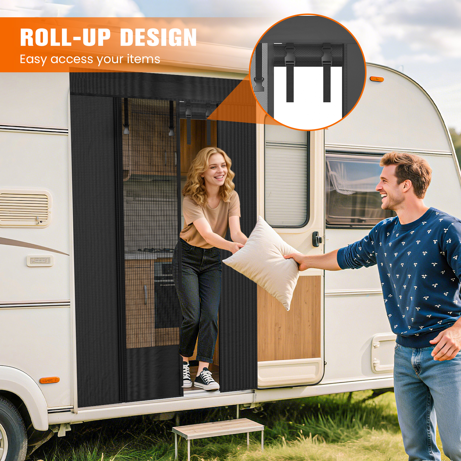 Features magnets and zipper design for easy entry/exit. Adjustable buckle straps let you roll up the screen door securely when needed—perfect for quick access to items or enjoying the view!