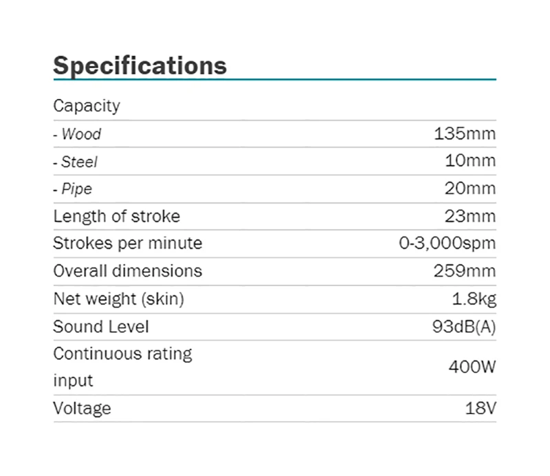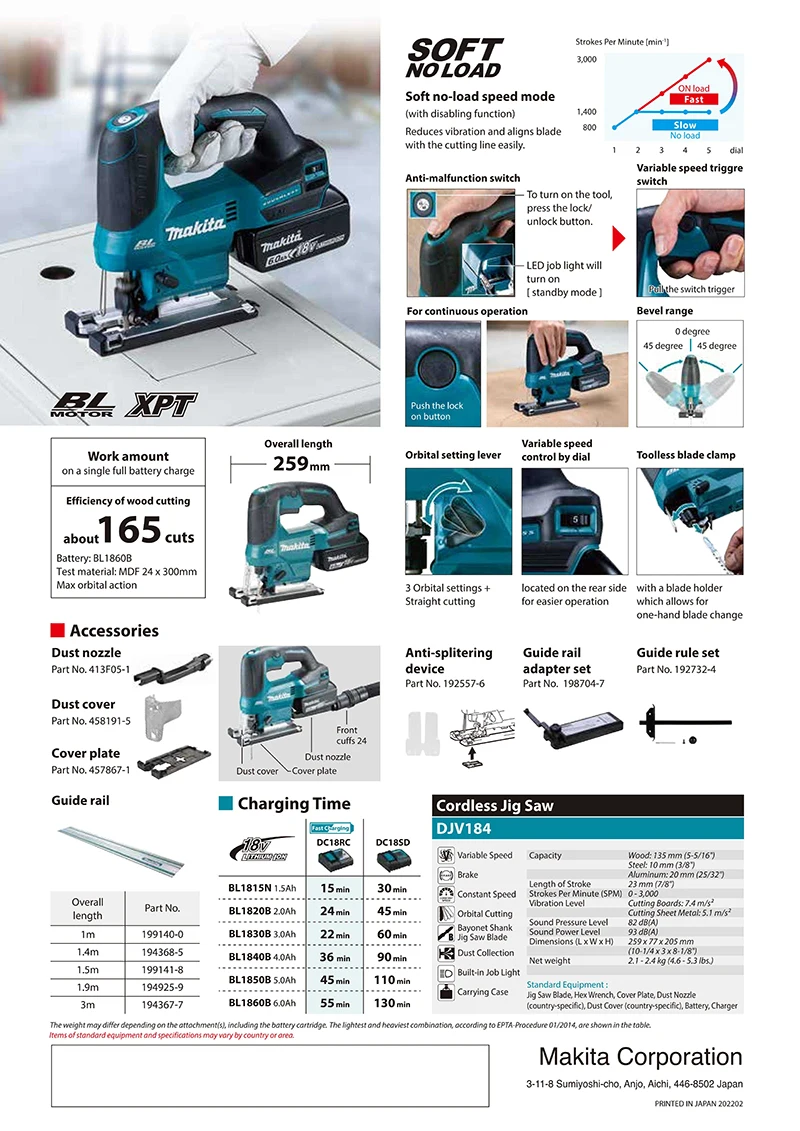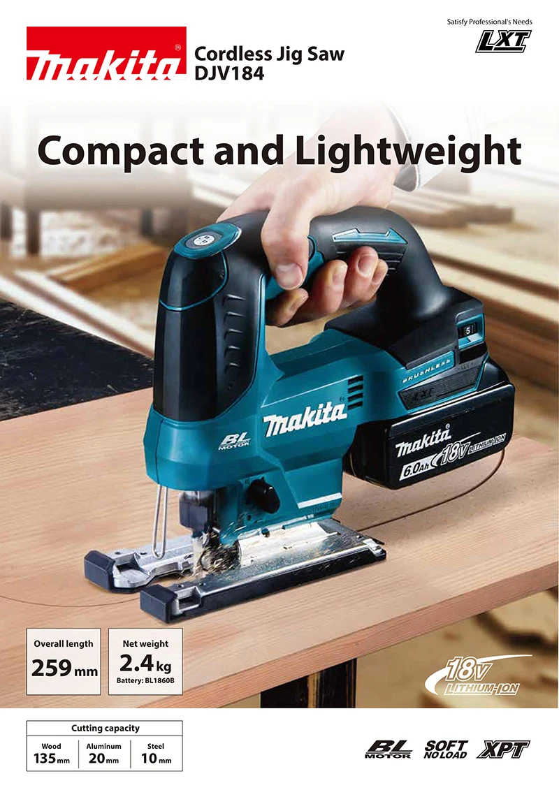 Due to using the same mechanical section as used for model JV103D of our 12Vmax CXT platform, DJV184 achieves not only compact and lightweight design but also cutting efficiency similar or superior to that of DJV180 in the main target application of thin material cutting