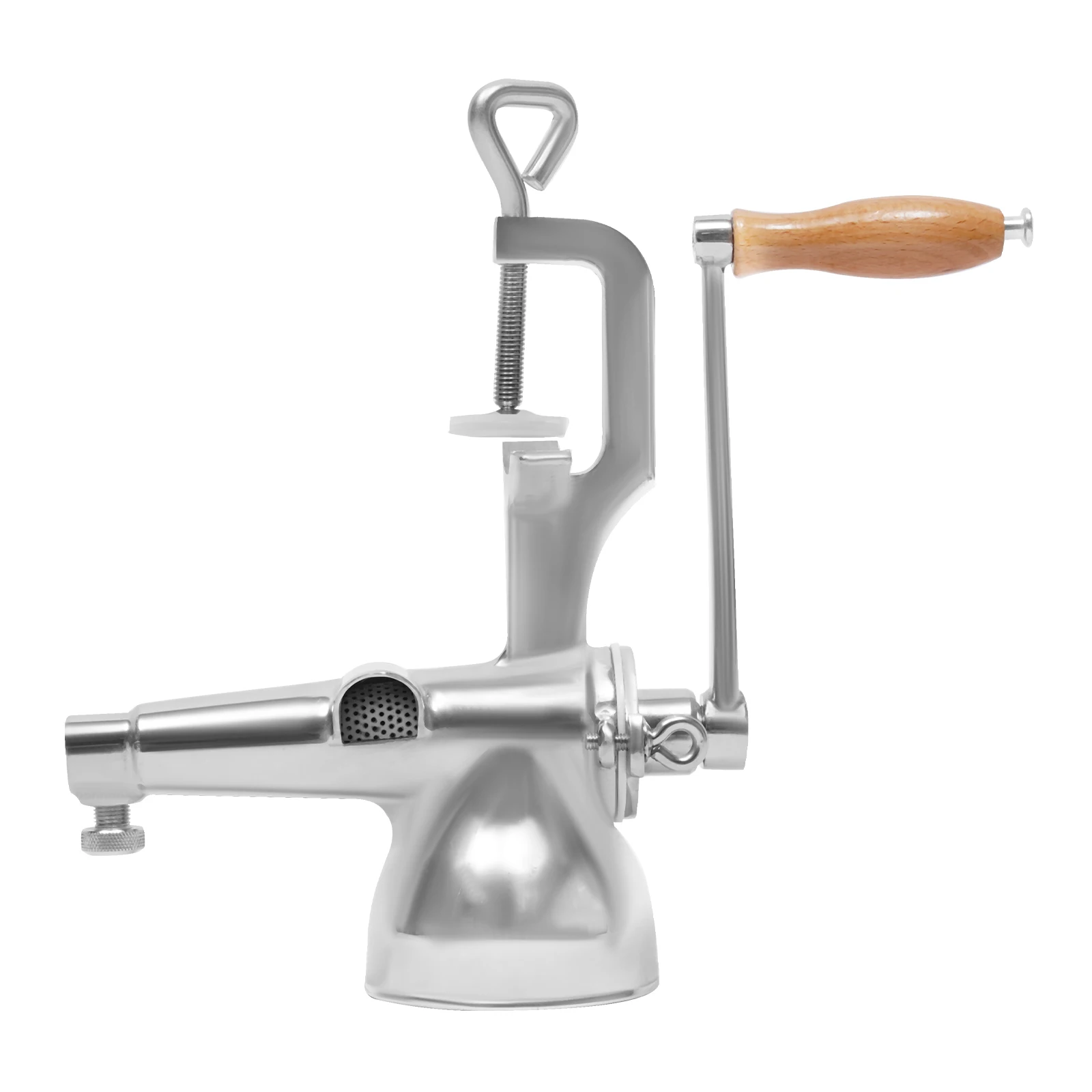 3. Put the food into the feeding port, turn the handle clockwise, the juice will flow out through the filter, and the slag will be discharged from the slag.